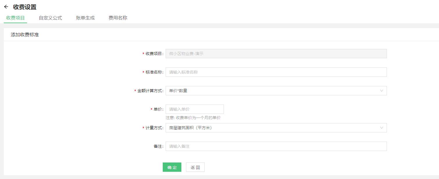 金额计算方式选择“单价\*数量”时,需要设置收费单价,如物业管理费单价为1.2元/平,则填写1.2。