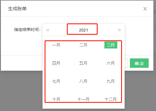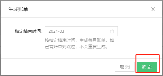 * 选择指定结束时间(按指定结束时间,生成每月账单,如已有账单则跳过,不会重复生成。)