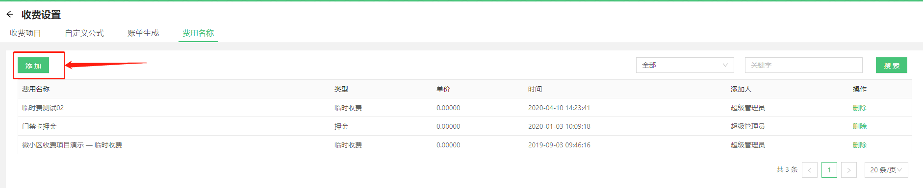 * 登录微物业管理中心=》收费管理=》收费设置=》费用名称 界面,