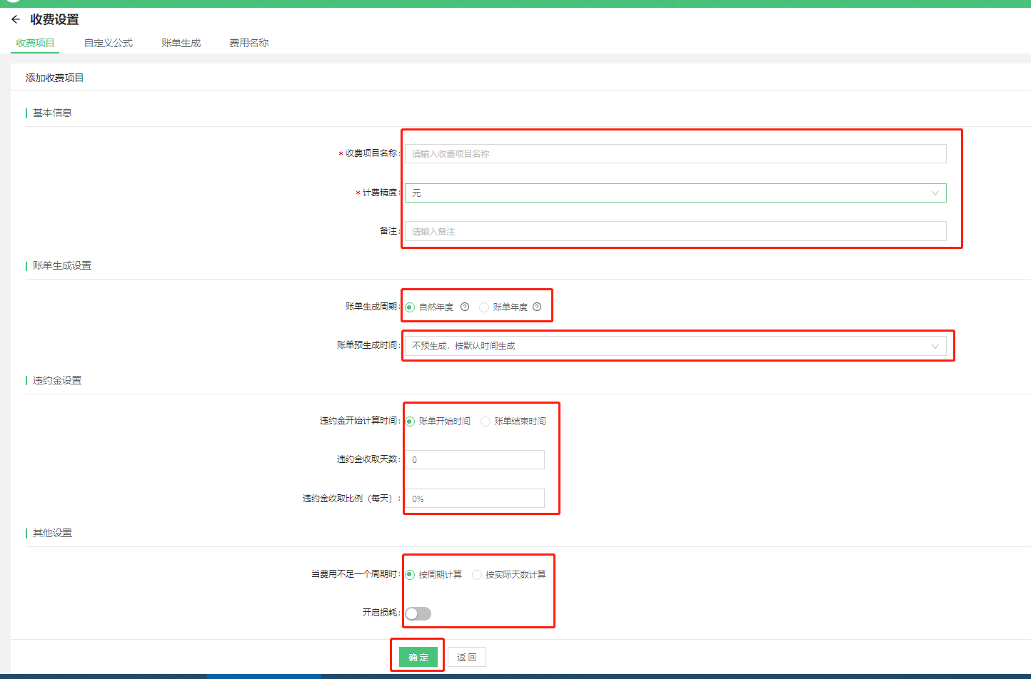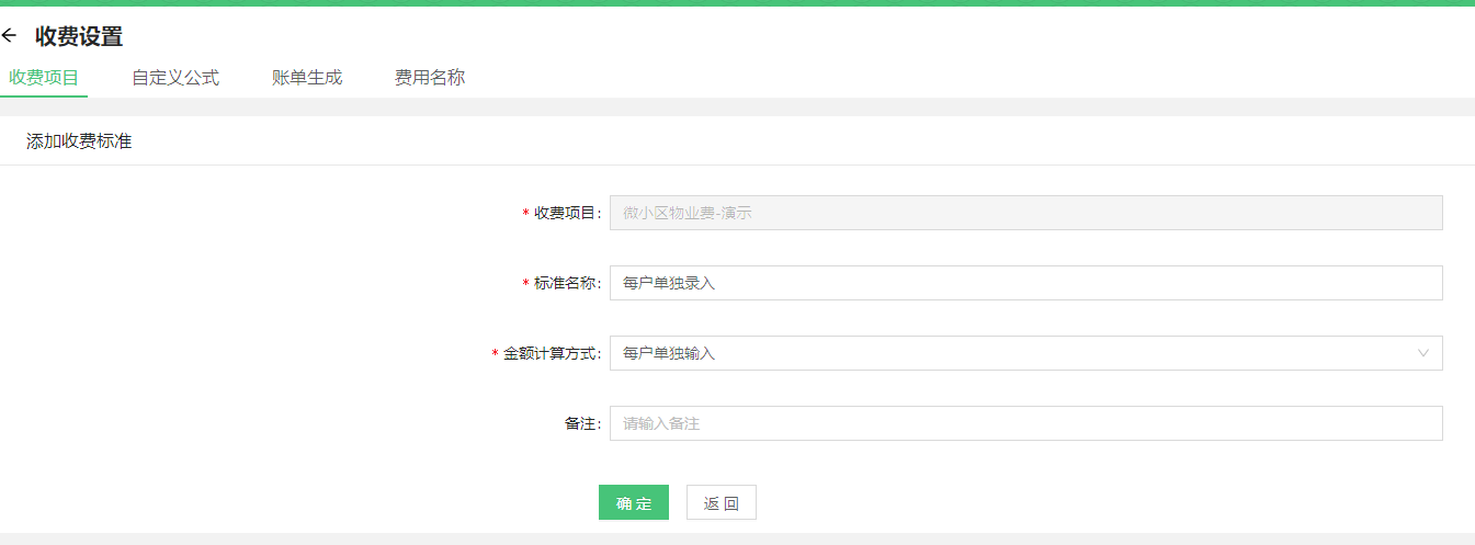 D、自定义公式:需要预先添加公式,适用于金额计算方法比较复杂的收费项目,如,阶梯电费。点击链接查看[自定义公式](https://www.kancloud.cn/weixiaoqu/weixiaoqu/473005)