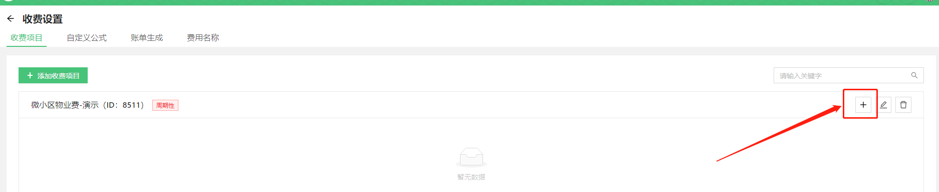 * 登录微物业管理中心 —》 收费管理 —》 收费设置 — 》收费项目,进入收费项目管理界面。(我们可以看见系统已经内置了一个收费项目:微物业物业管理费-演示,可以参考该收费项目,添加其他收费项目)