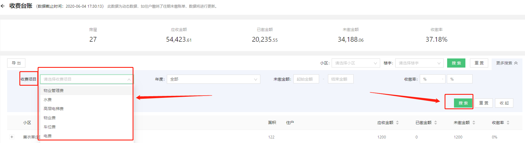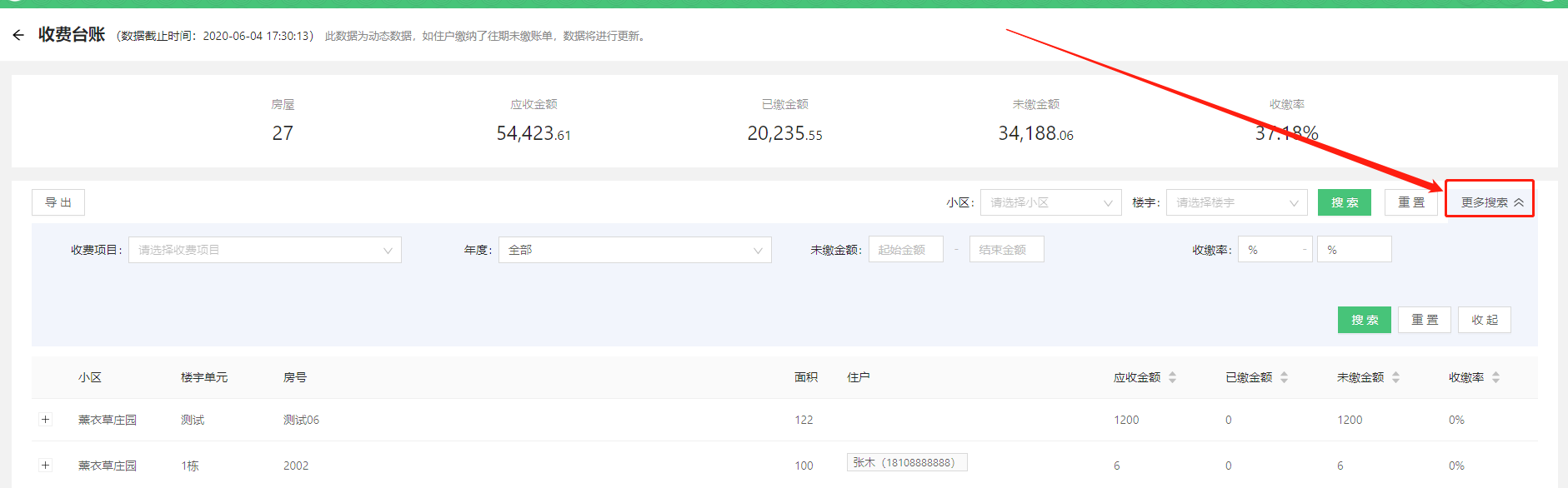 * 进入产品与服务=》财务管理=》收费台账,即可看到小区所有房屋的台账信息。如下图: