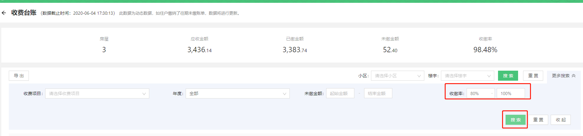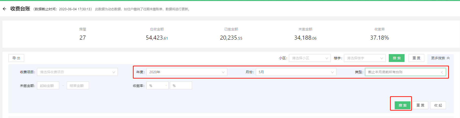 > * 台账数据为动态数据,如住户缴纳了往期未缴账单,数据将进行更新。