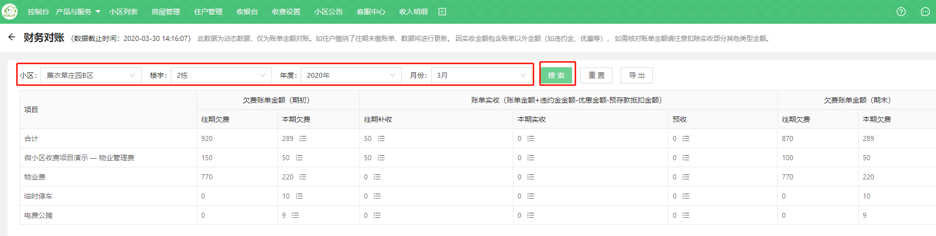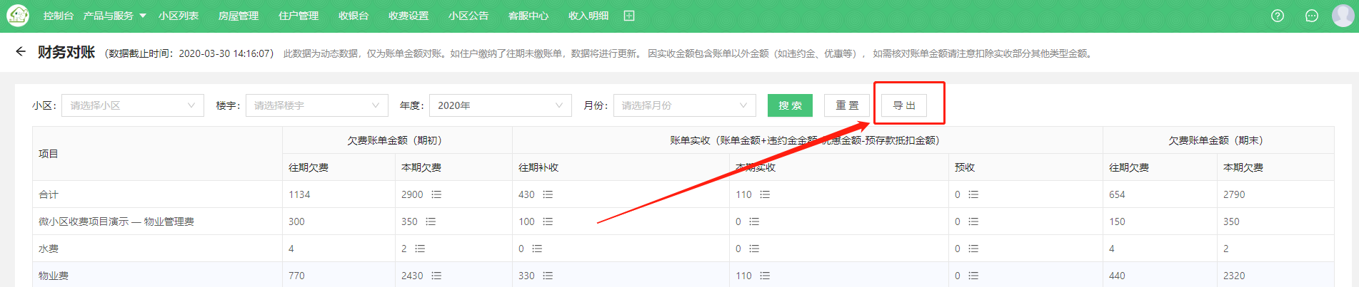 * 进入产品与服务=》财务管理=》财务对账,即可看到小区的对账信息。如下图: