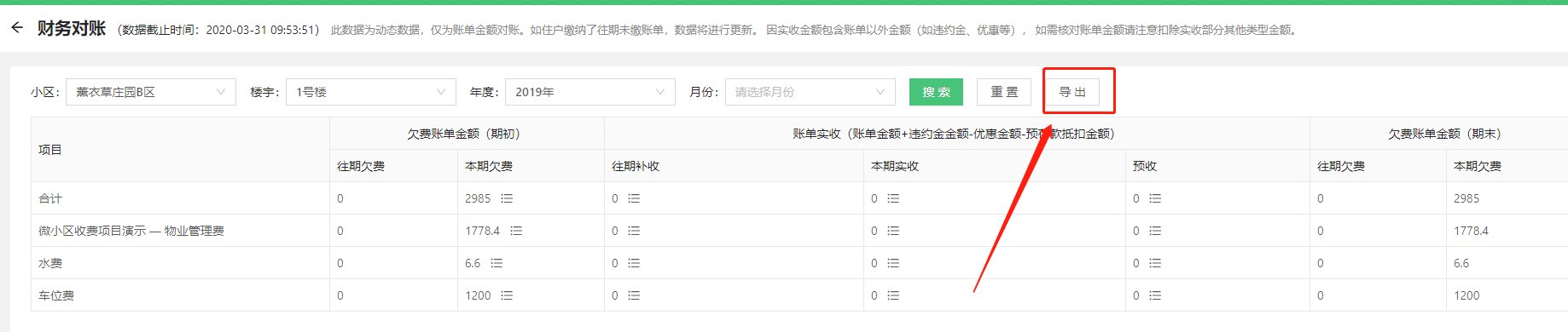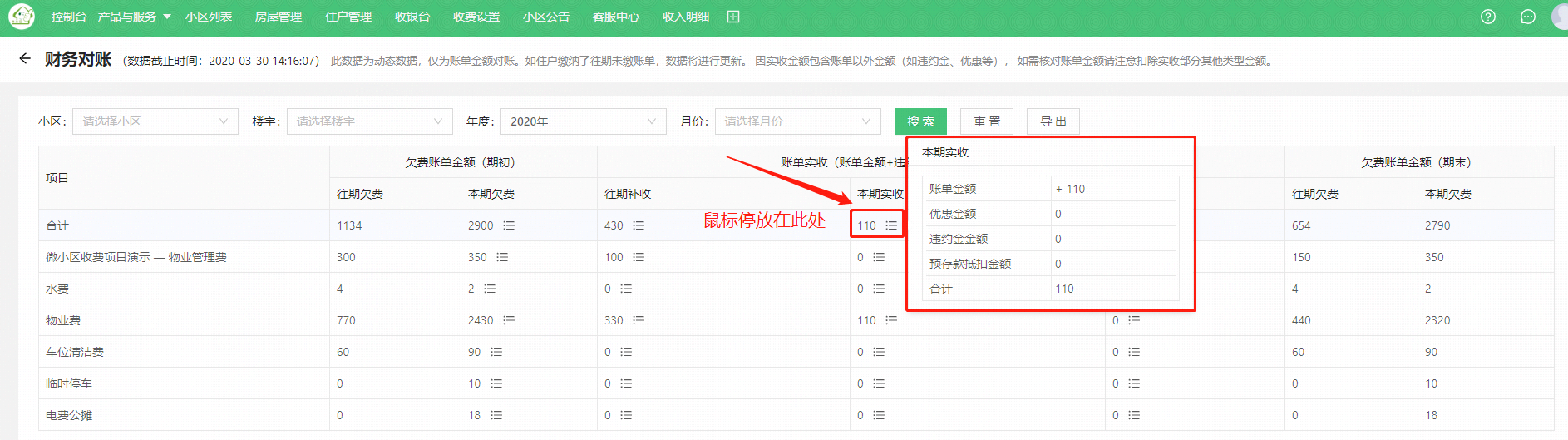 > * 此数据为动态数据,仅为账单金额对账。如住户缴纳了往期未缴账单,数据将进行更新。 因实收金额包含账单以外金额(如违约金、优惠等), 如需核对账单金额请注意扣除实收部分其他类型金额。