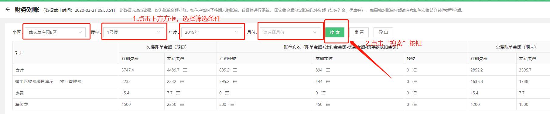* 可按照小区、楼宇、年度、月份不同条件查看对账信息,选择条件后点击“搜索”按钮,如下图:
