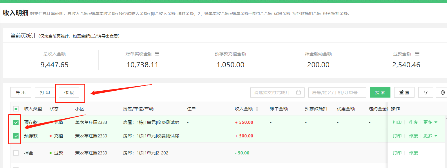 勾选需要作废的缴费记录,再点击“作废”按钮,如下图: