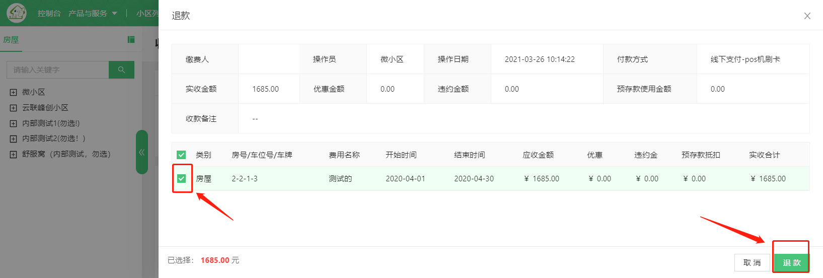 | 退款 | 住户缴费后,如需对已缴的账单进行退款,可使用此功能。选择退款方式、退款操作后,系统会对退款做记录。 |