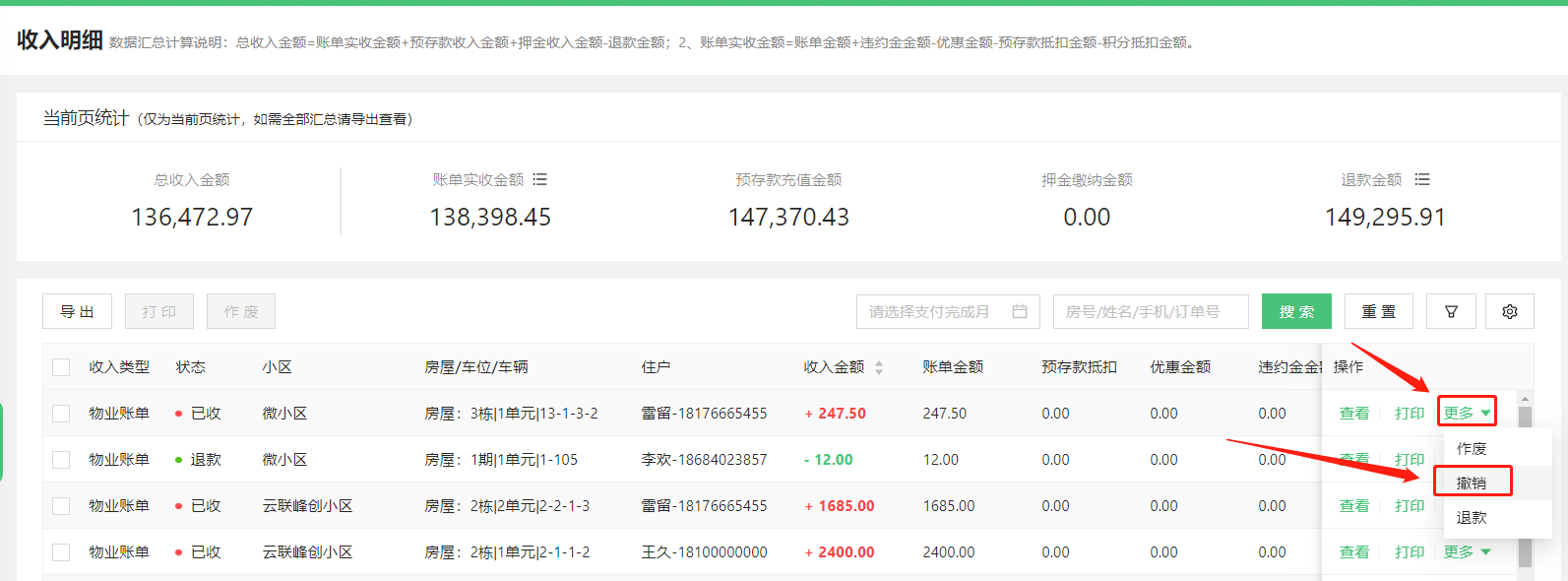 住户缴费后,如有需要可对缴费记录做对应操作。