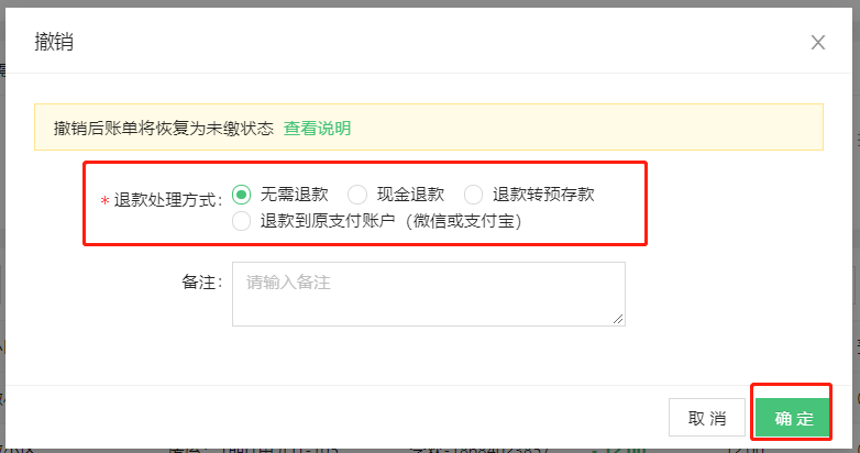 撤销后,本次缴费记录将清除,对应账单重新变为未缴状态。