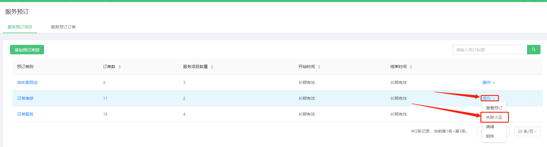服务预订添加后需要关联小区,关联小区后才能在小区微信/支付宝端**服务预订**模块进行显示(如小区微信/支付宝端无服务预订模块,请到小区列表—》微站设置界面进行添加),服务预订关联小区如下图所示: