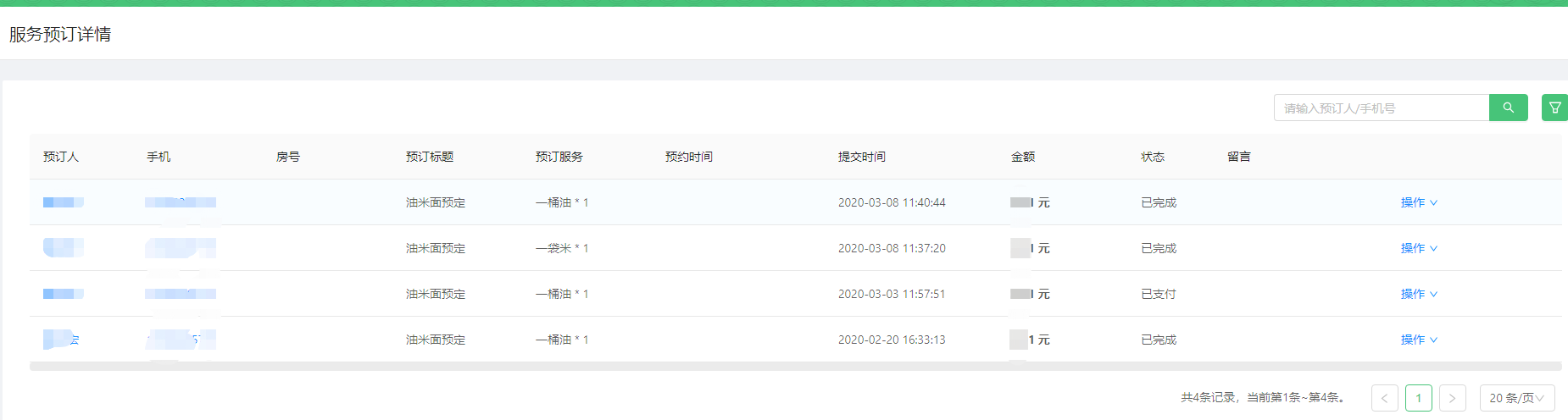 住户在微信/支付宝端预订服务之后,管理员可以登录微物业管理中心,点击相应的服务预订操作栏中的”查看预订“按钮,查看及管理该项服务的预订记录,如下图所示: