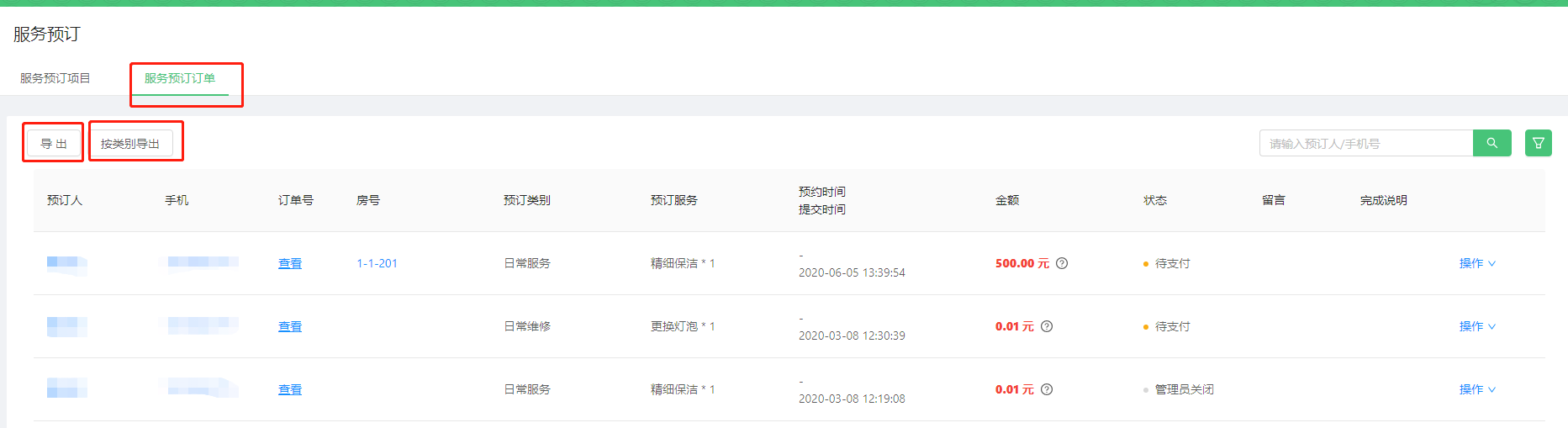 > * 待支付状态的服务预订订单管理员可操作关闭,关闭后住户需重新下单;