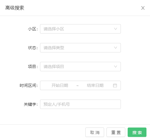 订单列表中,通过右侧筛选条件进行搜索,即可根据小区、状态、项目、时间区间、关键字进行订单筛选。