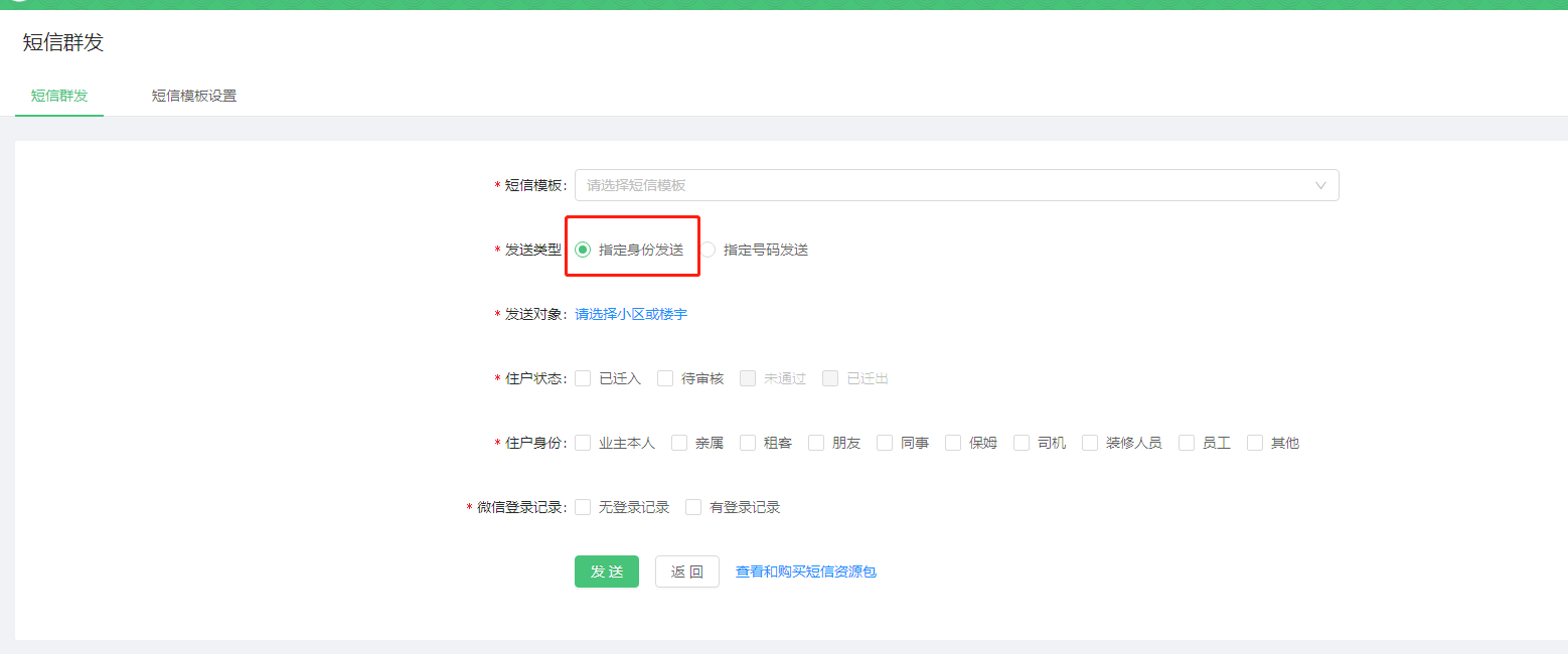 * 指定身份发送,即通过选择小区或楼宇,向该小区或楼宇下的特定身份的住户群发短信;