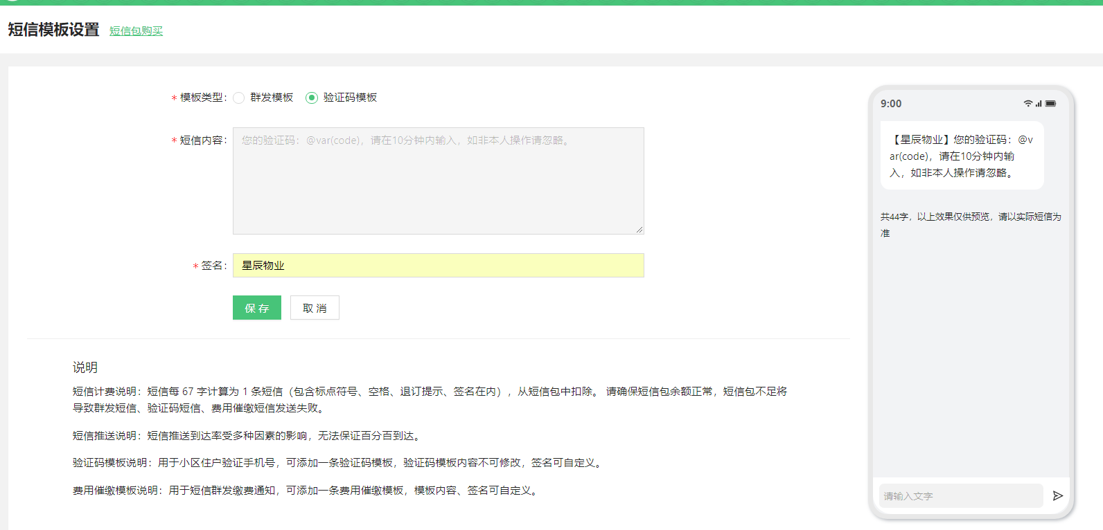 新添加的短信模板,会进入审核阶段,请耐心等待审核结果。如果多次审核不过,请联系微物业客服处理。签名最好使用公司名或小区名的简写。