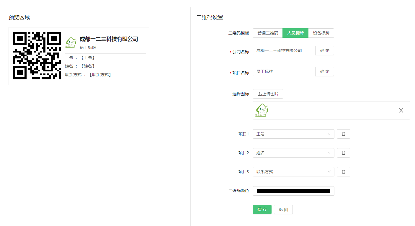 为满足不同场景需要,我们提供了普通二维码、人员标牌、设备标牌三种二维码样式以供选择。