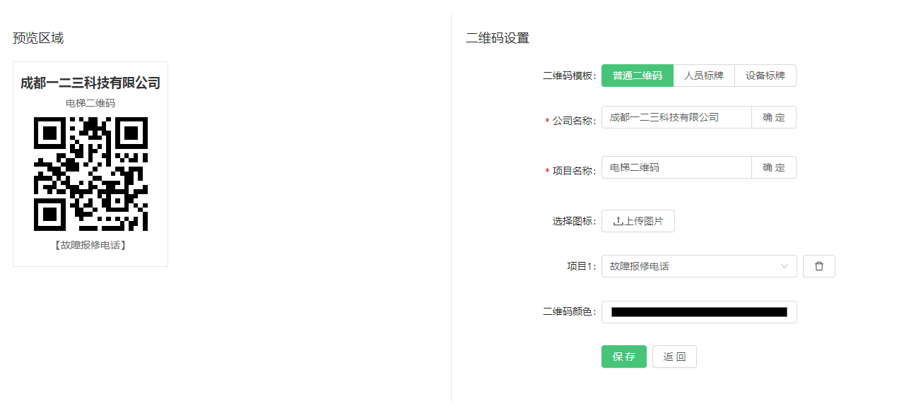 以电梯巡检为例:需在模板中设置设备编号、设备地点、维保信息、报修电话等。每创建一个电梯的巡检二维码时,根据模板填写每台电梯对应的设备编号、设备地点、报修电话等具体信息即可。便于工作人员快速、标准化创建设备二维码。