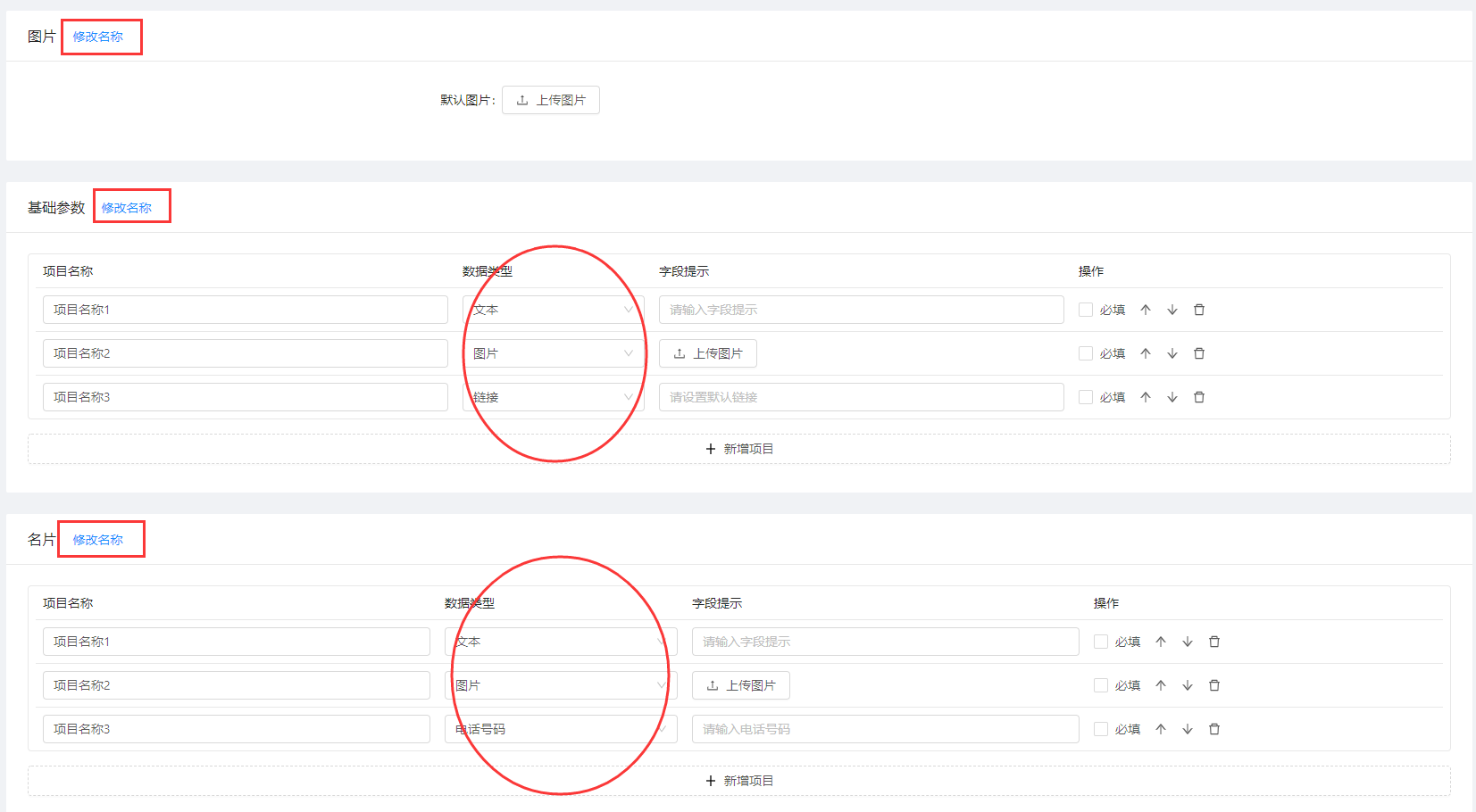 在模板编辑页面,可以自由修改各分组名称、添加所需记录字段,选择数据类型,设置显示顺序以及是否必填等多种操作。