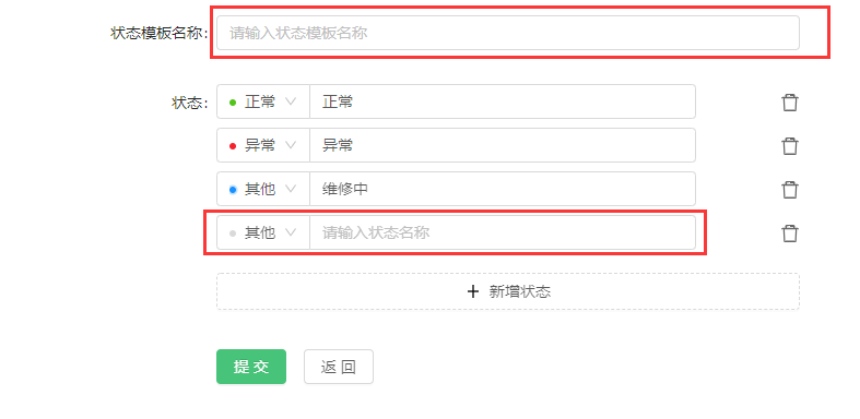 在状态模板编辑页面中,可自行设置状态模板名称,状态名称以及对应颜色显示。