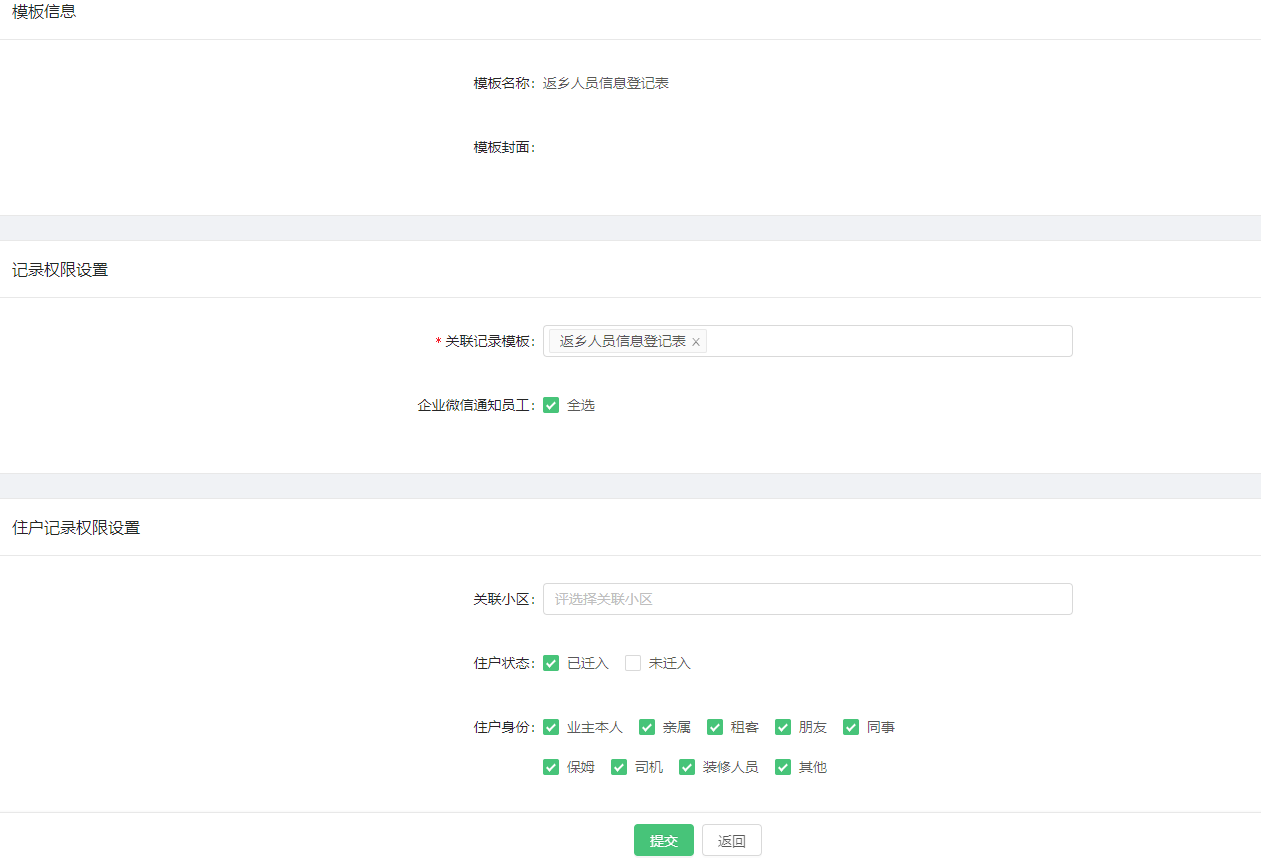 选择设置权限时,可根据住户、管理员的身份不同分别设置记录权限及记录次数。