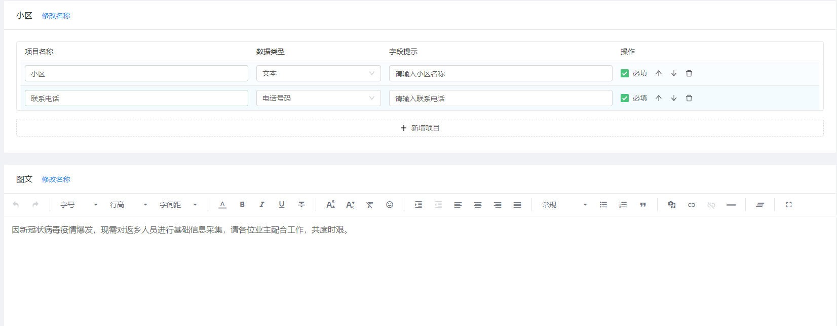 在模板编辑页面,可以自由修改各分组名称、添加所需记录字段,选择数据类型,设置显示顺序以及是否必填等多种操作。