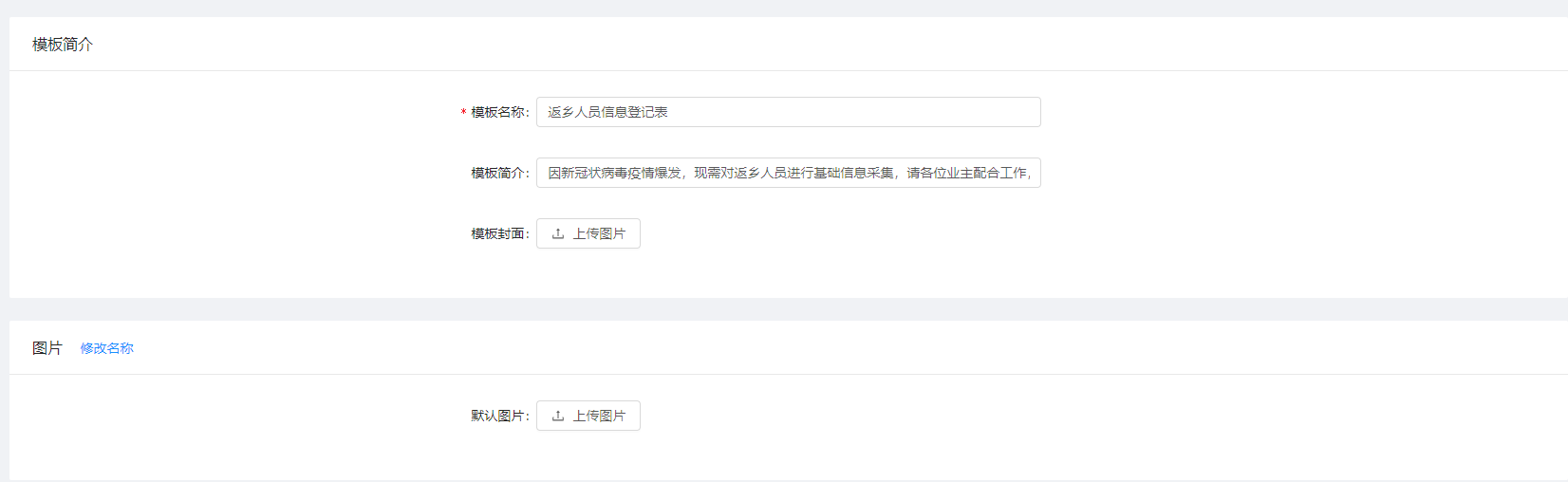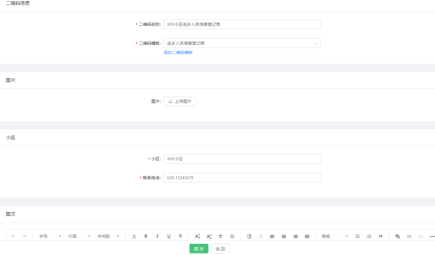 > * 在模板设置中可上传默认图片、添加默认图文以及默认附件等,若具体添加二维码时不做修改,则自动显示这里的数据。