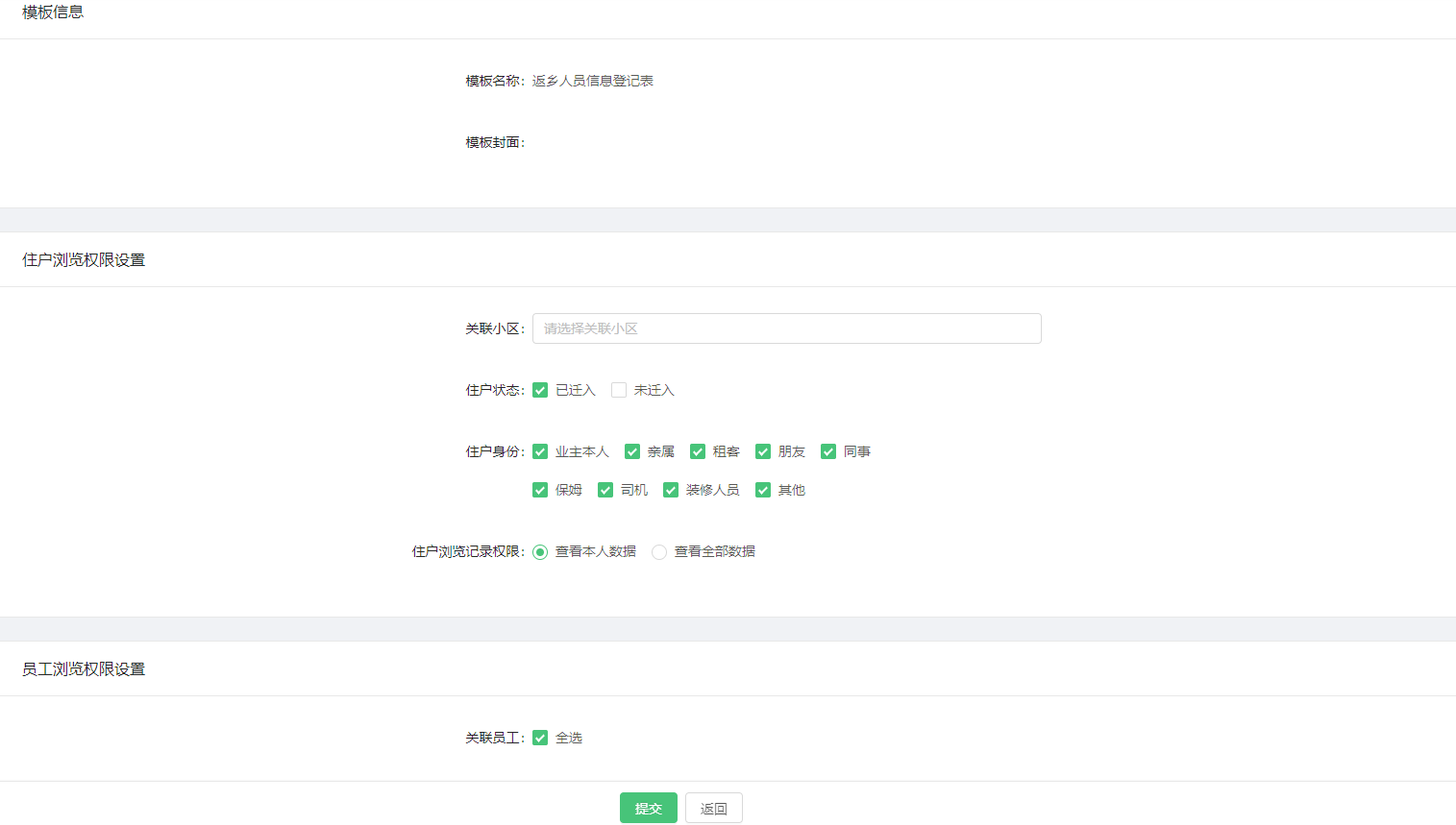 查看权限分为住户权限和员工权限,可分别针对住户和管理员两种身份分别进行权限设置。