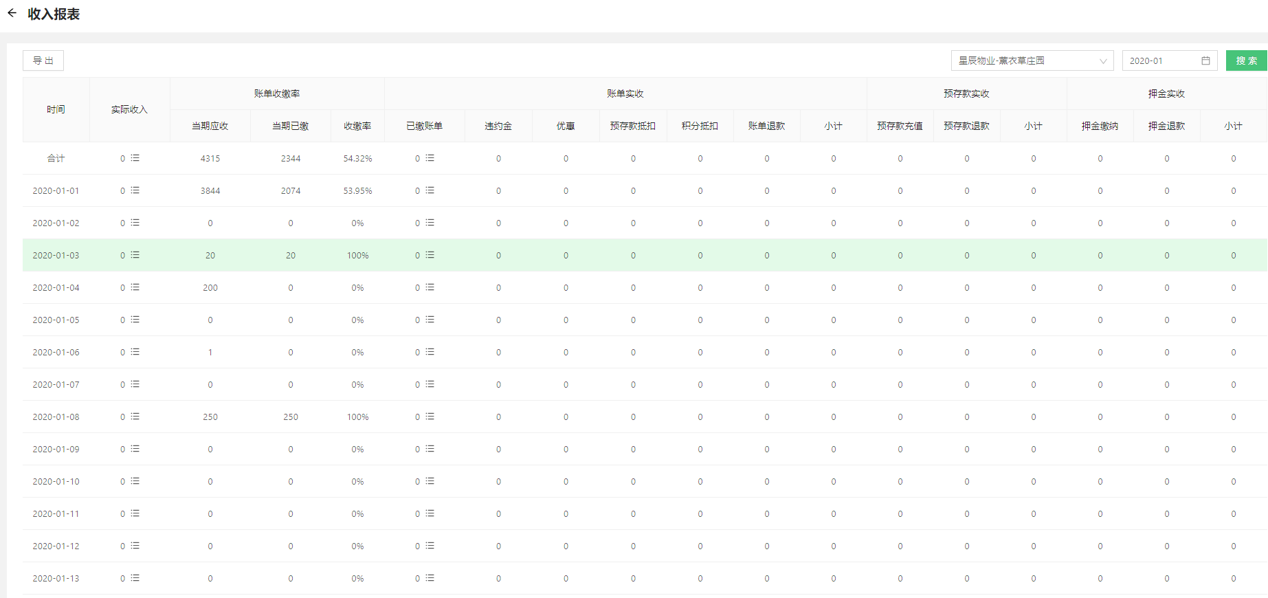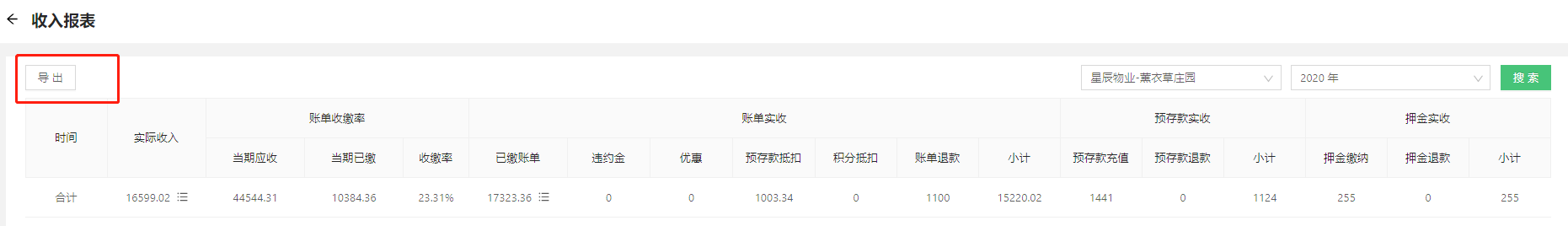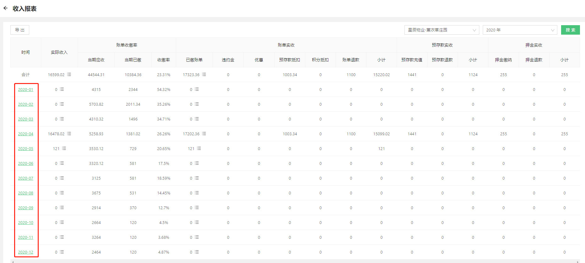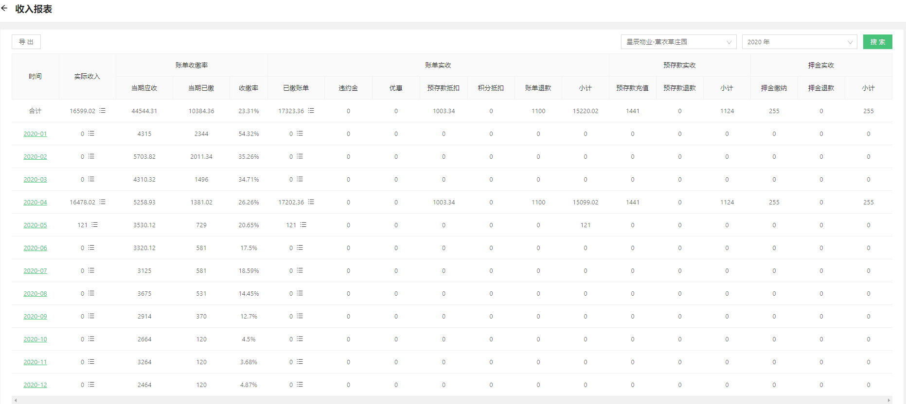 进入 微物业管理中心—》报表统计—》收入报表,即可按年度查看每月缴费率情况,包括,每月应收金额、实收金额、收缴率等。
