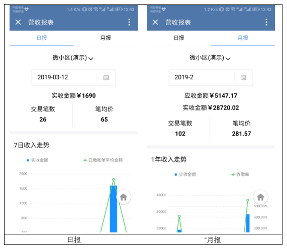 微物业报表统计分为月报、日报,自动统计小区每月、每日缴费情况,包括应收金额、实收金额缴费率等,并支持导出每日报表明细,利于财务核对每日账单。