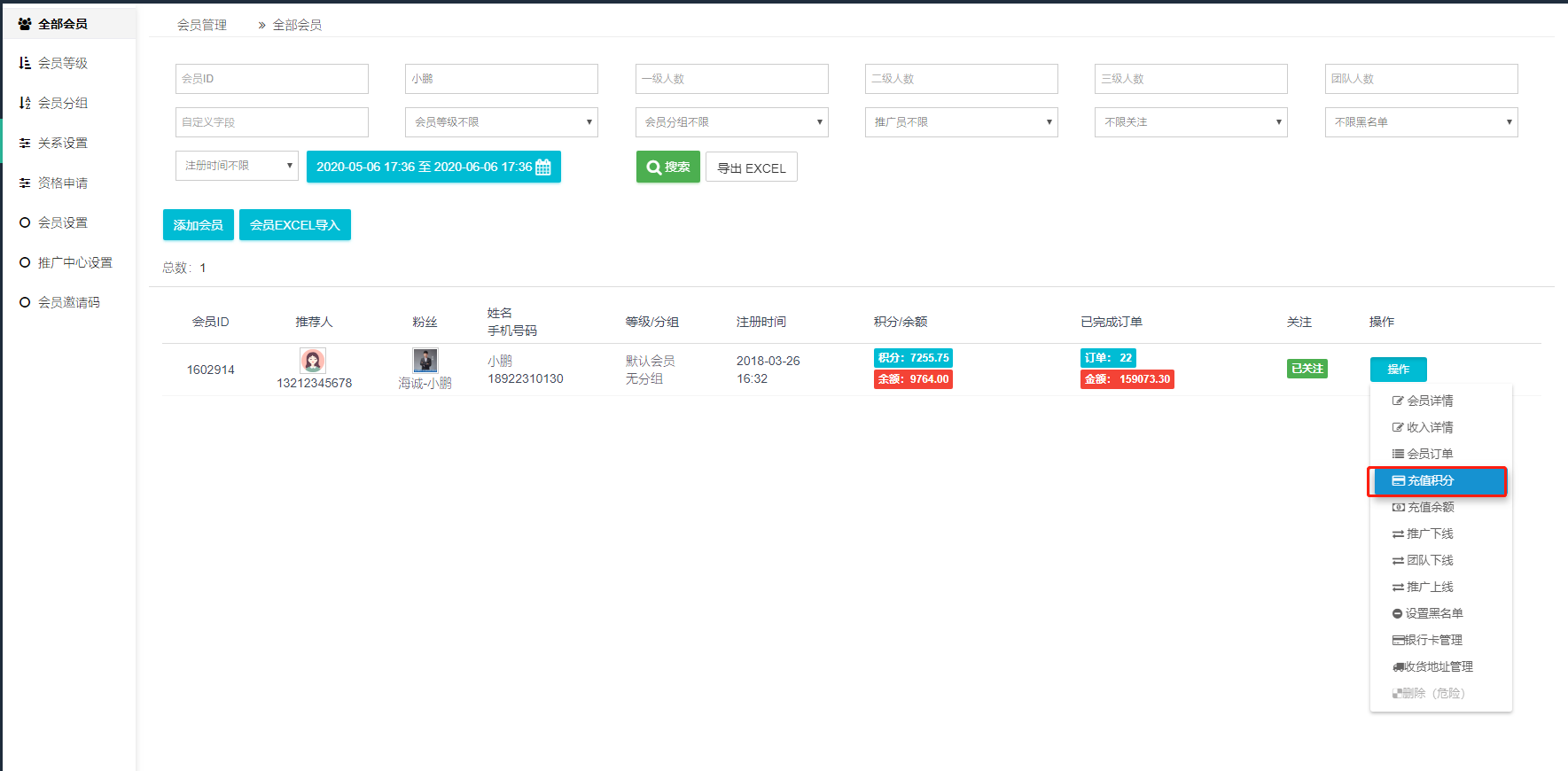 ## 1、会员管理——点击操作——充值积分