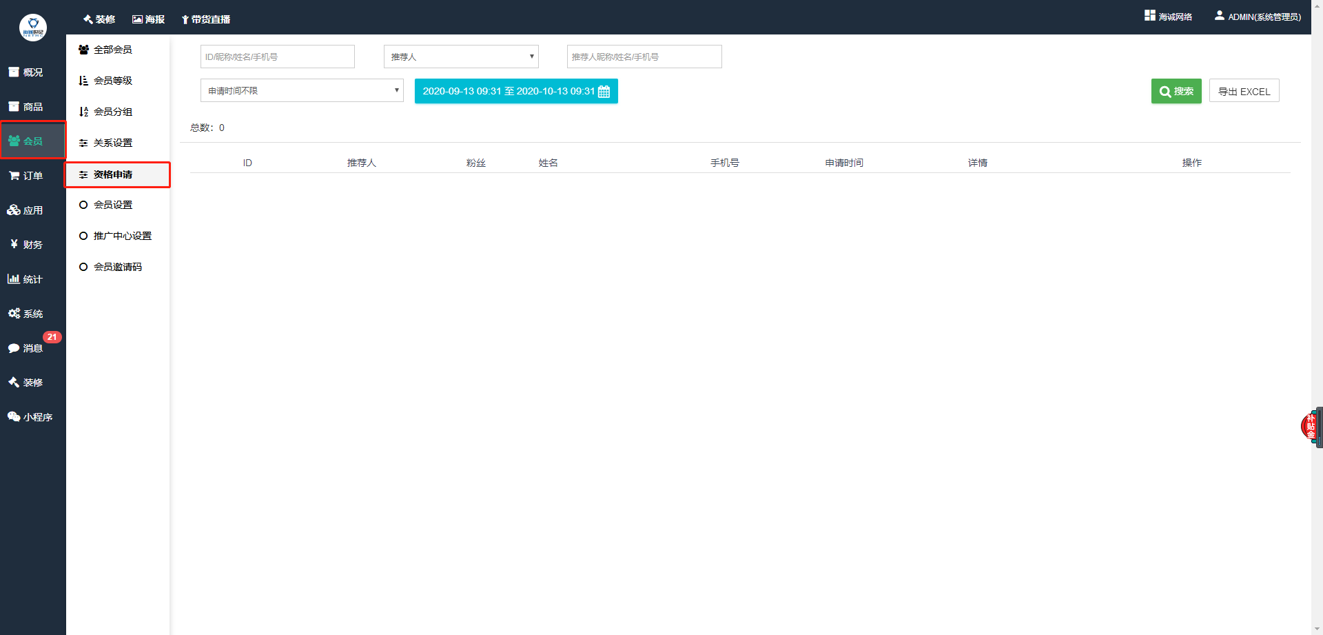 2、会员设置里面的资格申请处可查看申请获得推广权益的会员信息