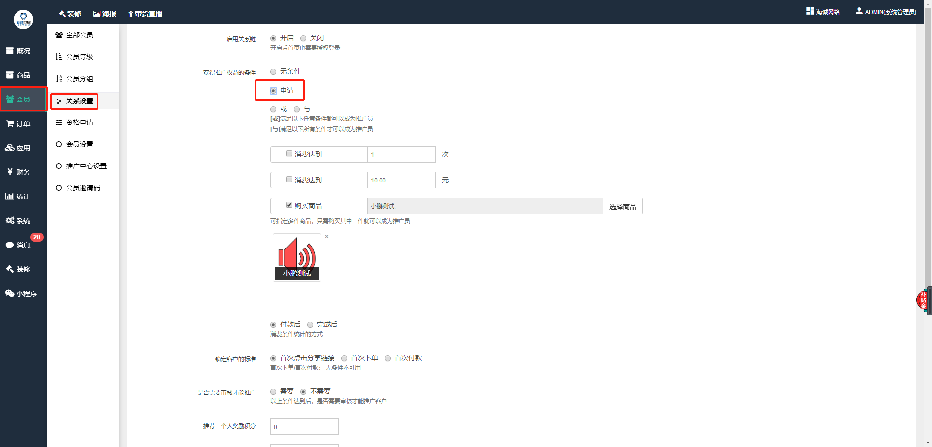 ## **1、商城后台——会员——关系设置——获得推广权益的条件——点击申请**