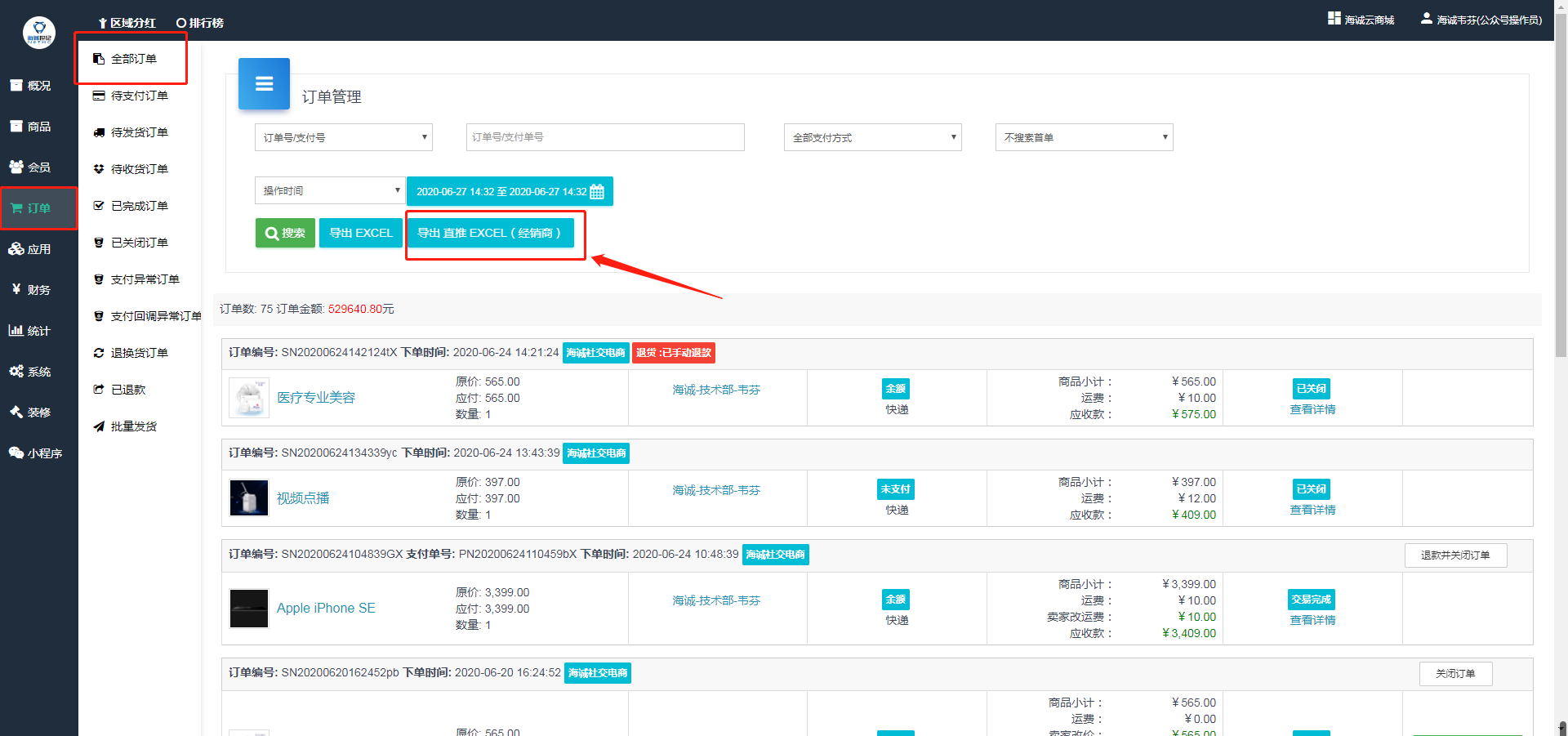 ## **用Excel文档的格式导出经销商直推的订单信息**