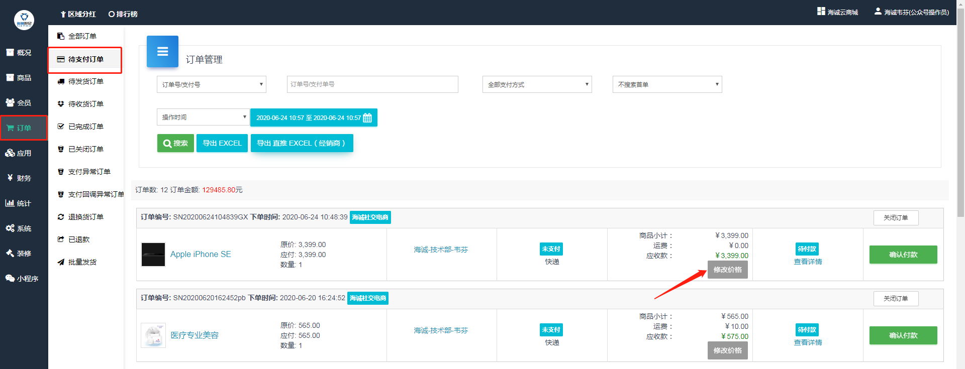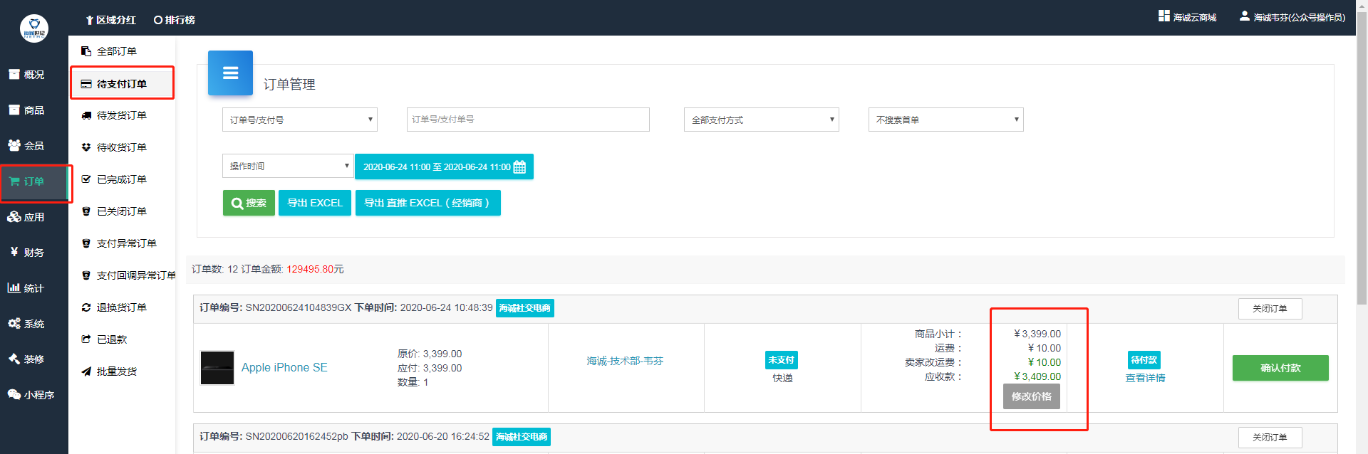 ## ⑵ 当买家下单还未付款时,商家可以在“订单管理-待支付订单”进行订单改价操作。如原基础上加价200元和10元运费(若在金额前输入“ —— ”号,则为减价)。后台点击“修改价格”: