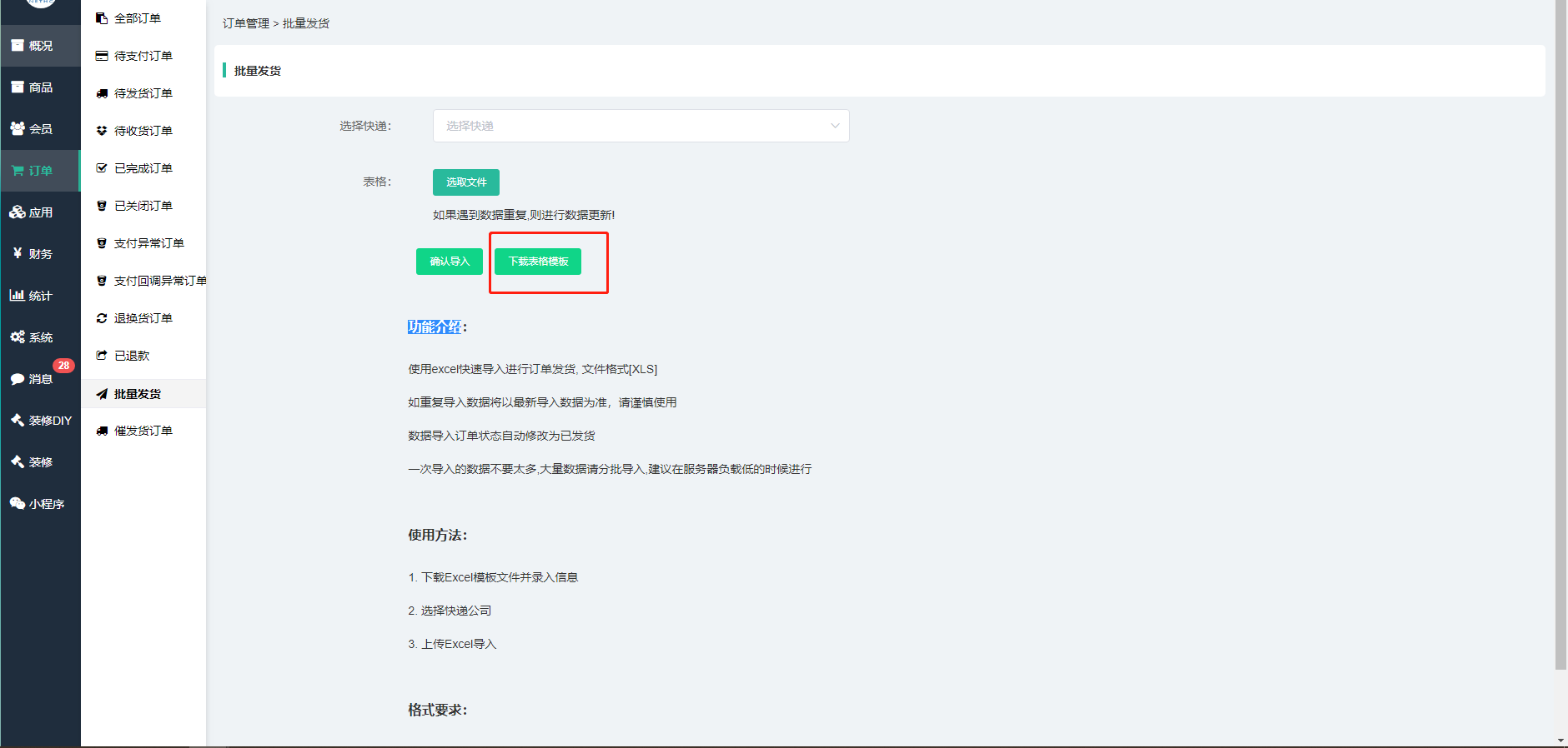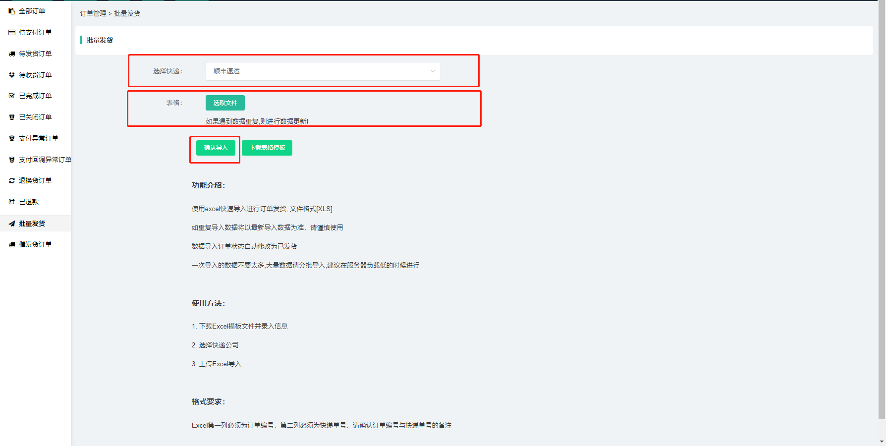 ## 7、将填写好的**批量发货文档**上传至后台,选择好发货对应**快递公司**,点击确认导入即可。这样子文档里面的所有订单都会变成**发货**状态。