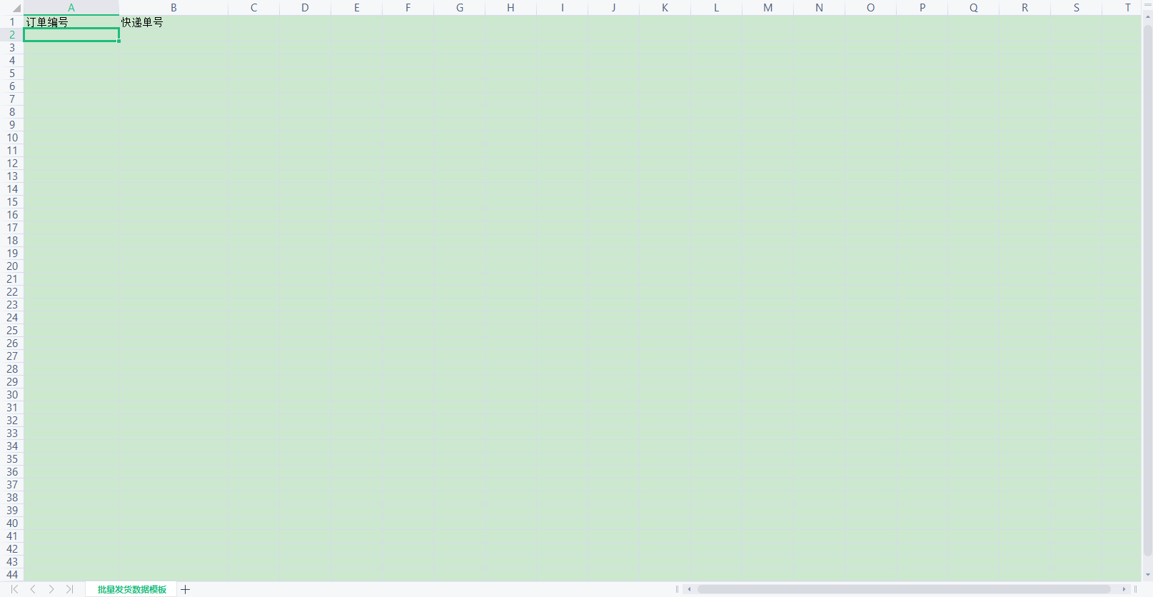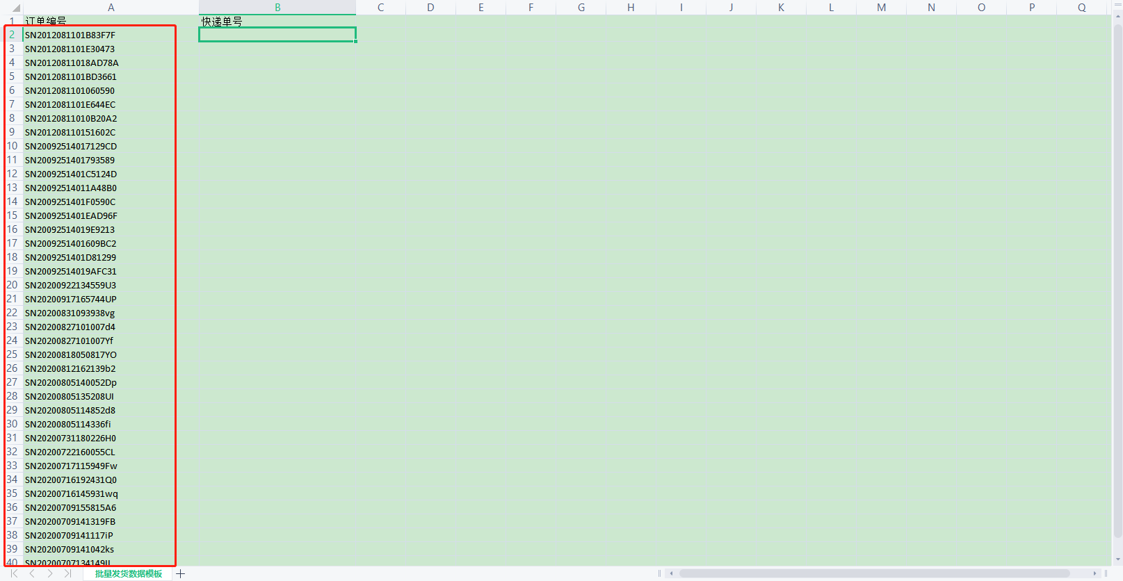 ## 6、将之前导出的**待发货文档**内的**订单编号**粘贴**进批量发货模板**文档内。**快递单号**则需要手动对应每个订单进行填写。