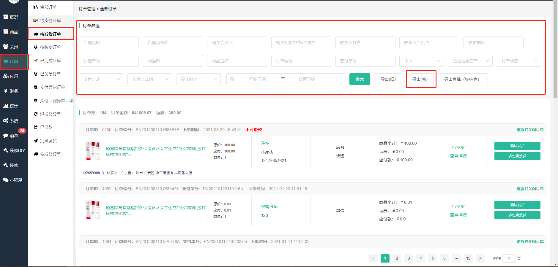 ## 1、进入商城**待发货**订单内,筛选导出需要**发货**的文档。