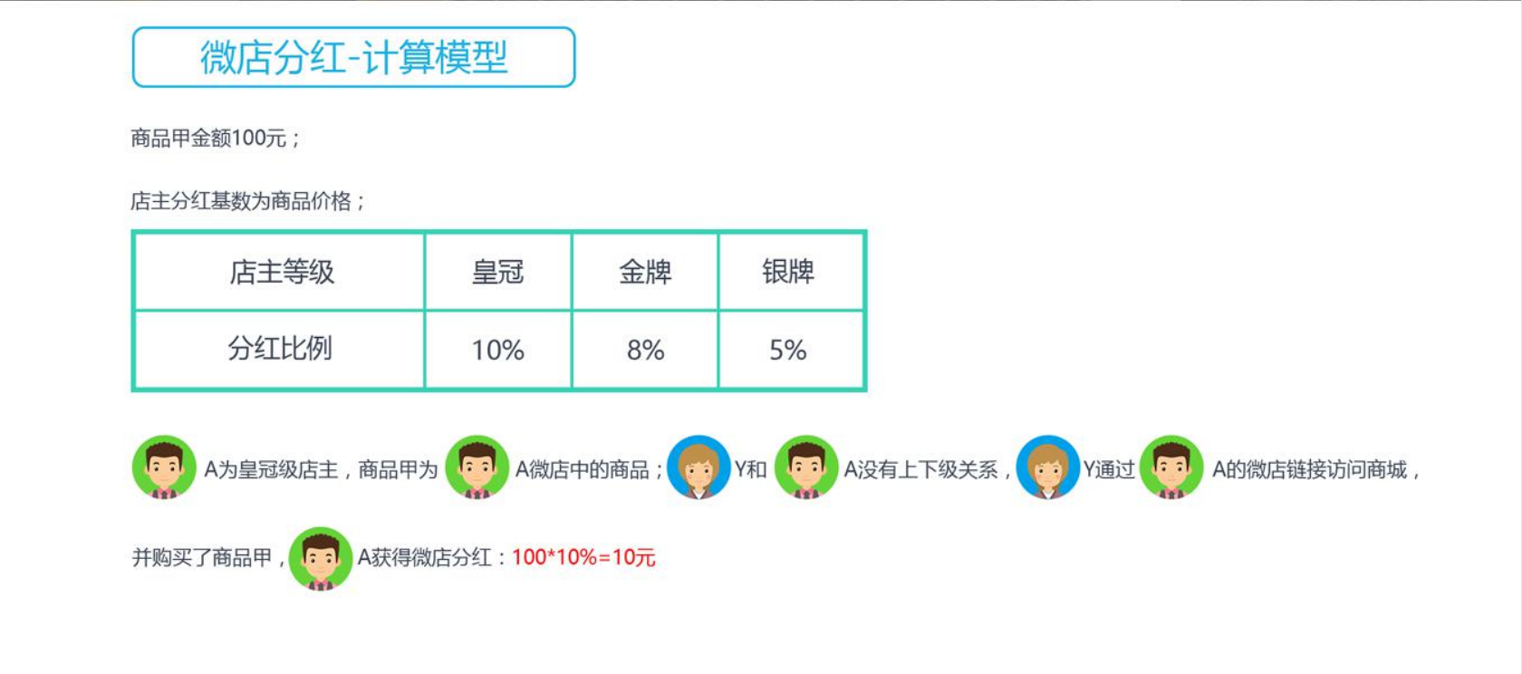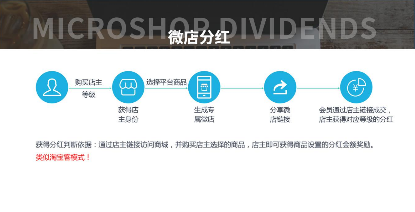 ## 用户成为微店店主后,可以选择平台商品,生成专属微店;分享微店后,只要有会员通过微店链接进入购买的,店主就可以获得商品设置微店分红,上级上线如果是店主,同样可以获得上级微店微店分红。