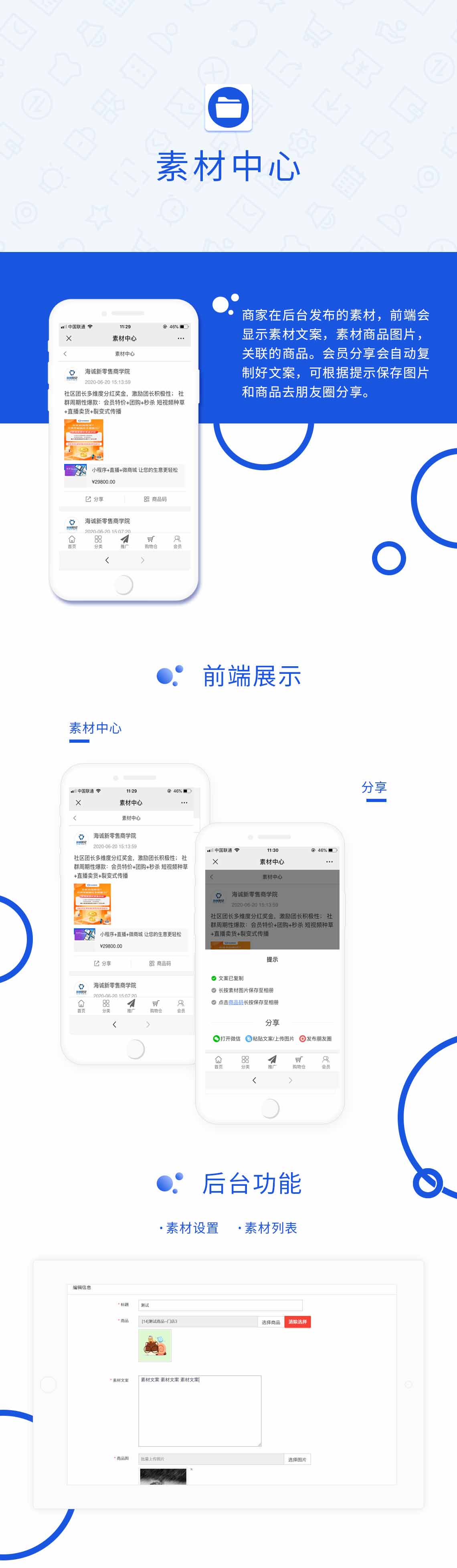 ## 商家在后台发布的素材,前端会显示素材文案,素材商品图片,关联的商品。会员分享会自动复制好文案,可根据提示保存图片和商品去朋友圈分享。