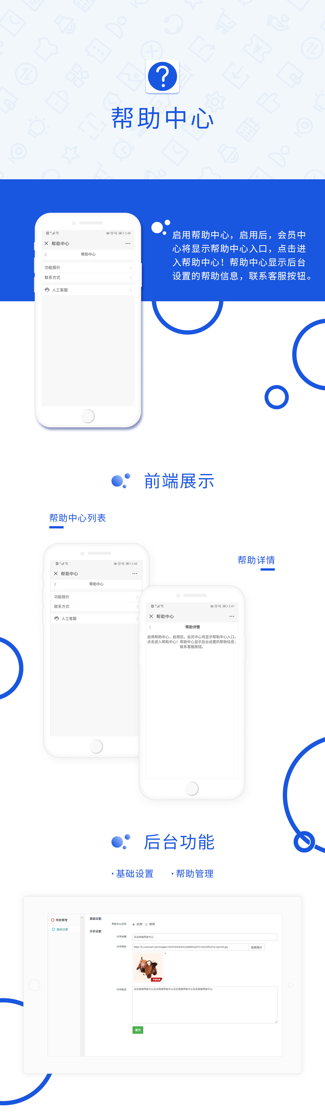 ## **帮助详情——**启用**帮助中心**,会员中心将显示‘帮助中心’入口,帮助中心显示的是后台设置的帮助信息(商城介绍、常见问题等),联系客服等按钮。