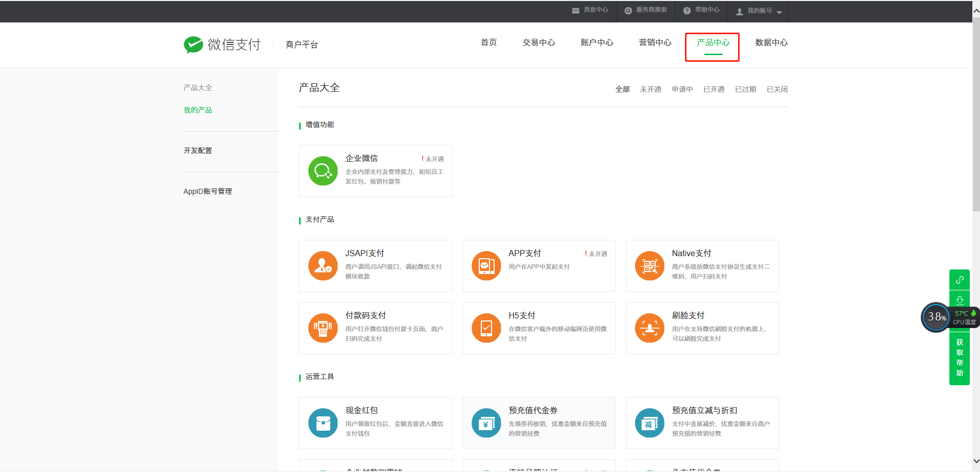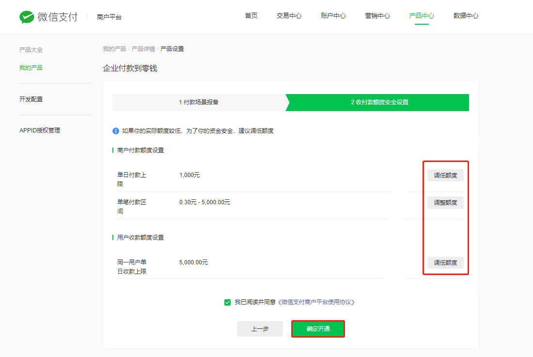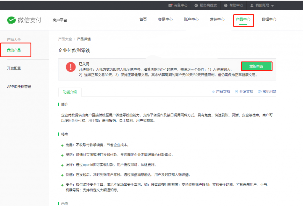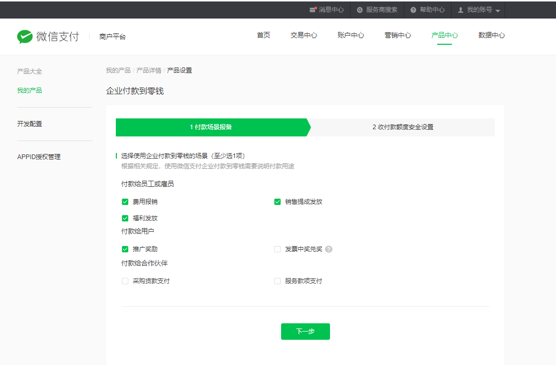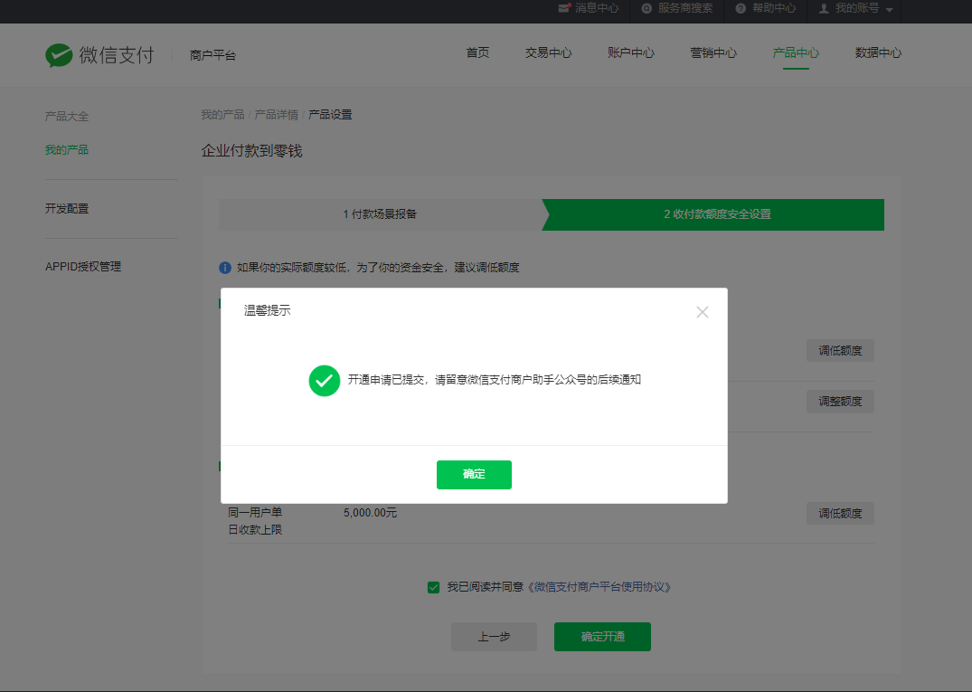 ## **1、登录微信支付商户平台——产品中心——企业付款到零钱——开启产品**