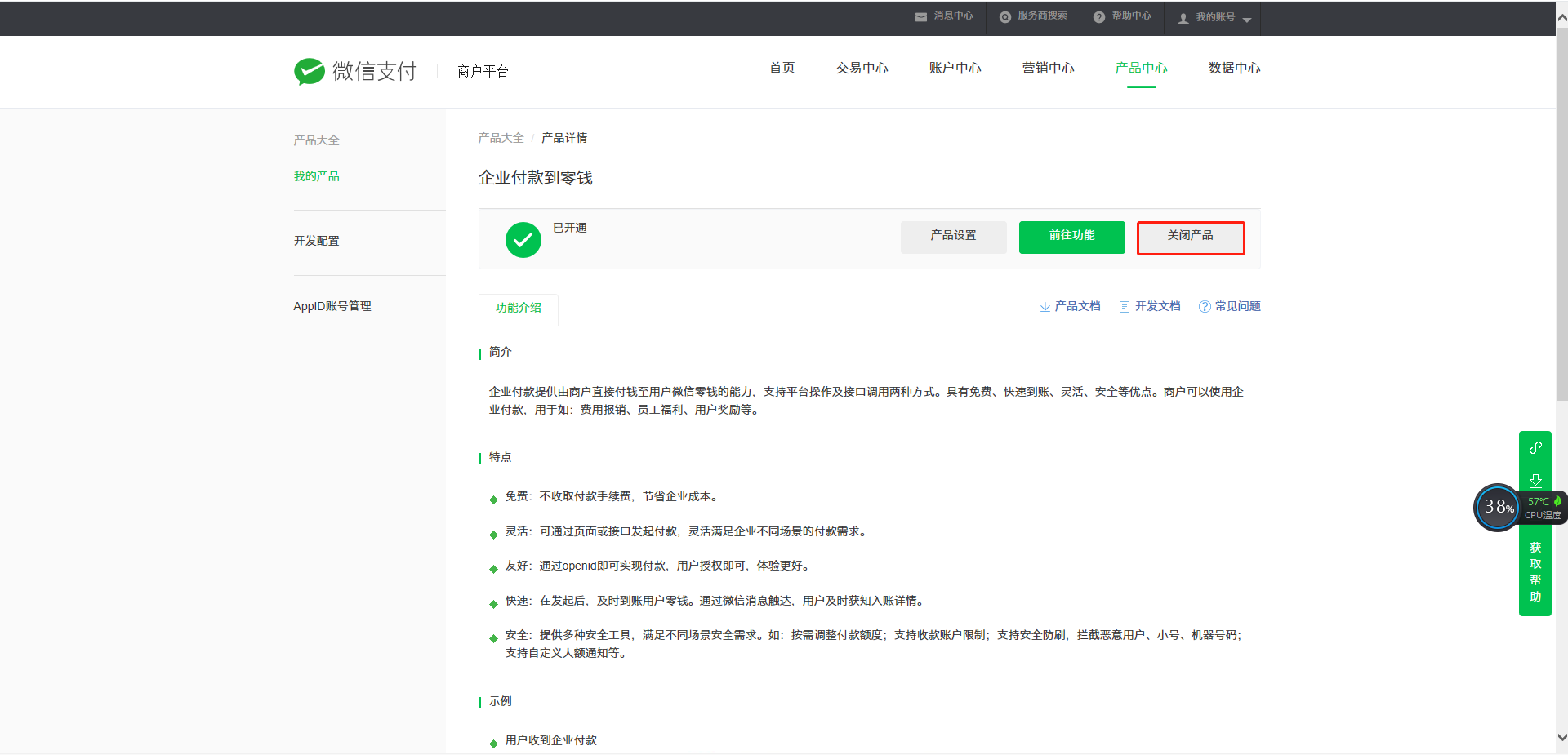 ## **1、登录微信支付商户平台——产品中心——企业付款到零钱——关闭产品**