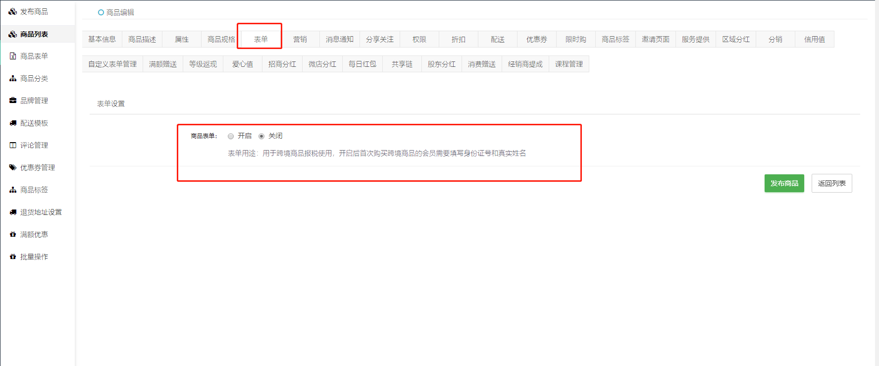 ## 2、到商品列表内或者发布一个新的商品的时候,开启表单功能,开启之后保存即可。