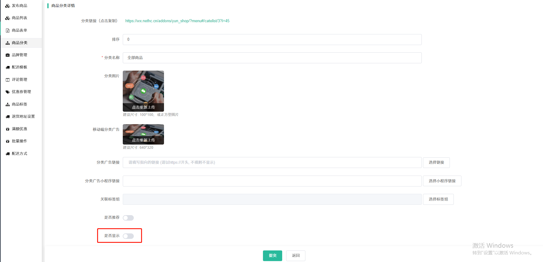 ## 2、 添加子分类(二级分类),点击已经创建好的一级分类子分类按钮即为创建二级分类,也是根据页面提示填写需要的资料。填写完之后是否要显示咱们选择“是”,如果不希望这个分类在前端显示的话就选择“否”,完成之后提交即可。