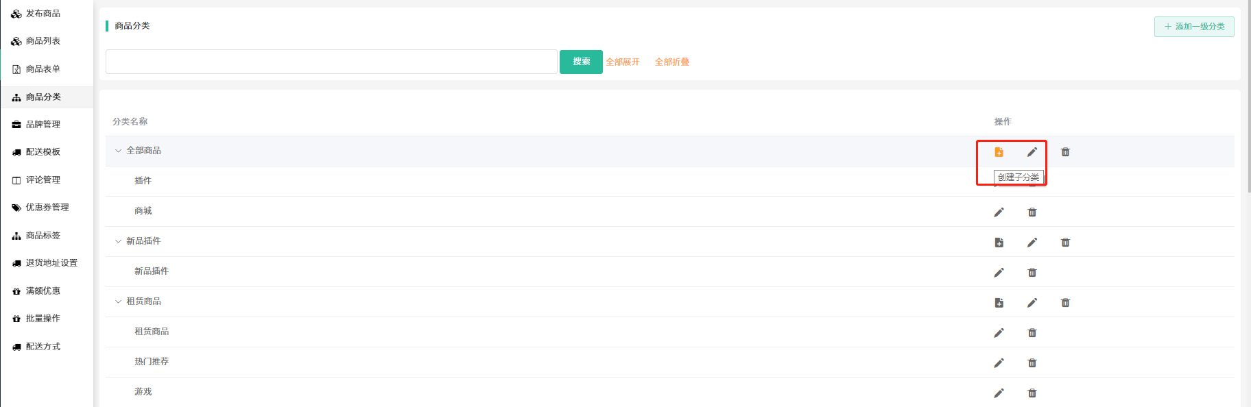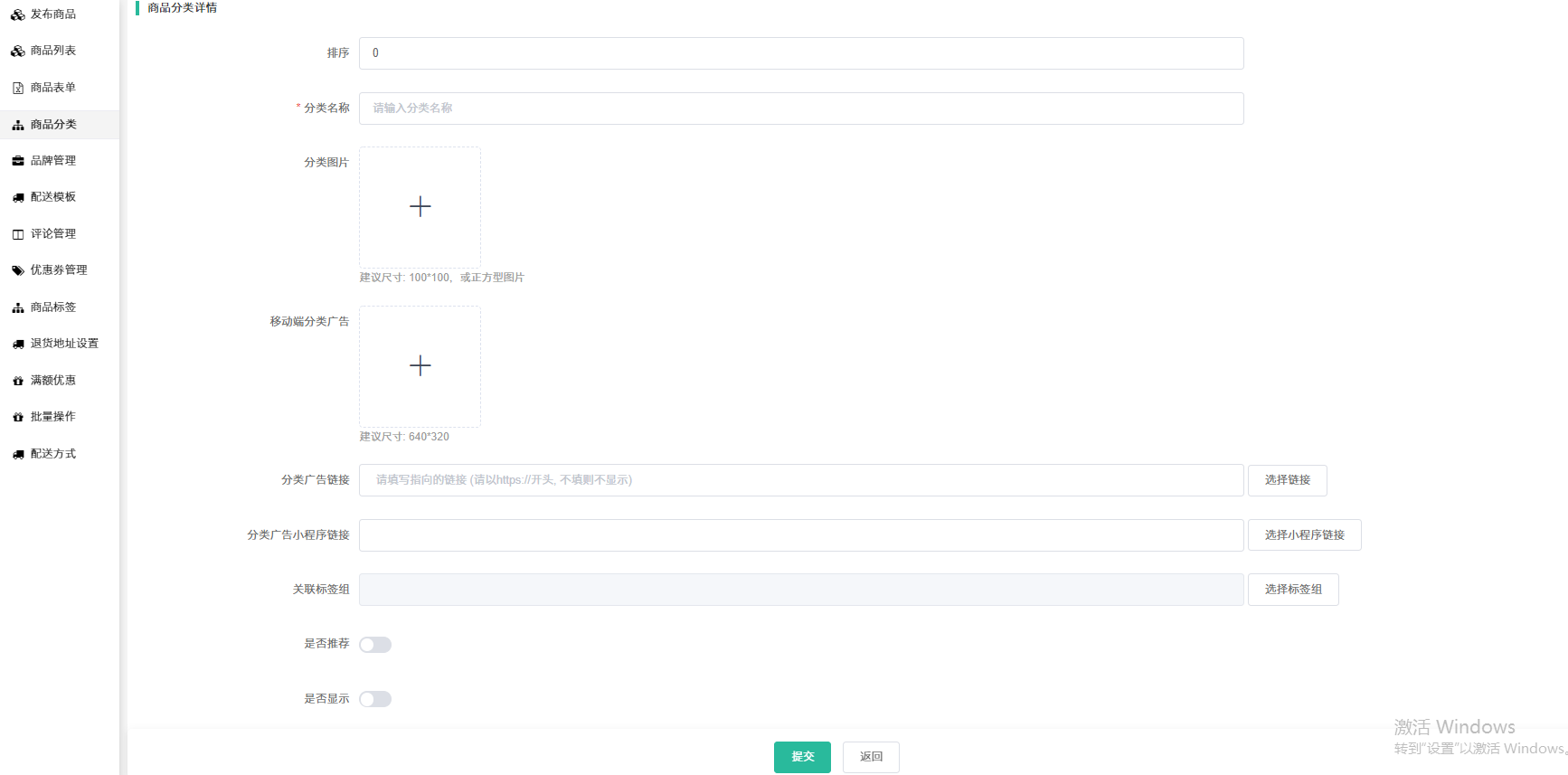 ## 1、 进入商品板块,添加商品分类。系统默认的分类层级为二级分类。最高可以调整成三级分类。