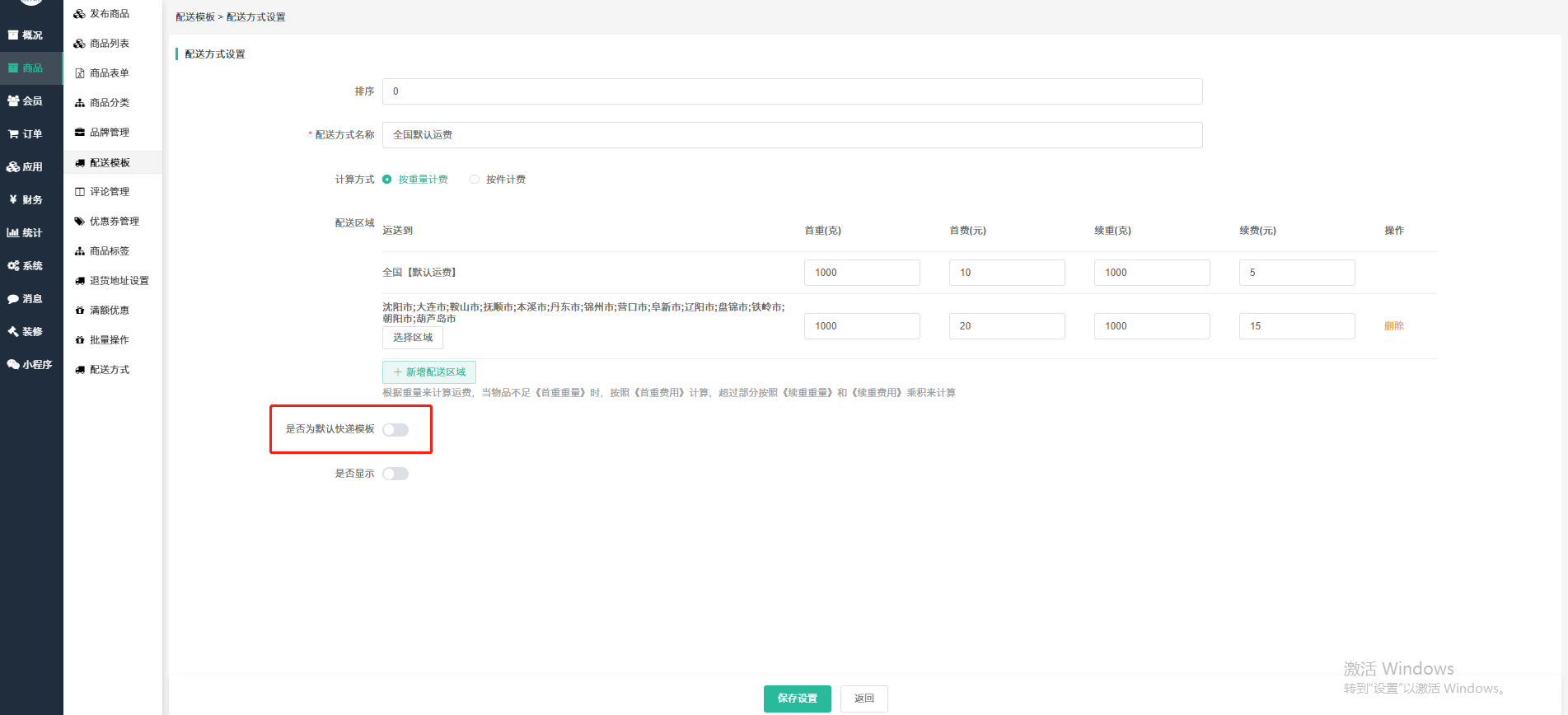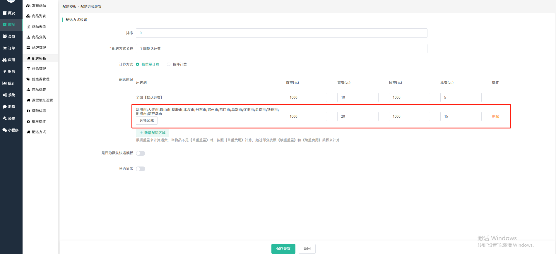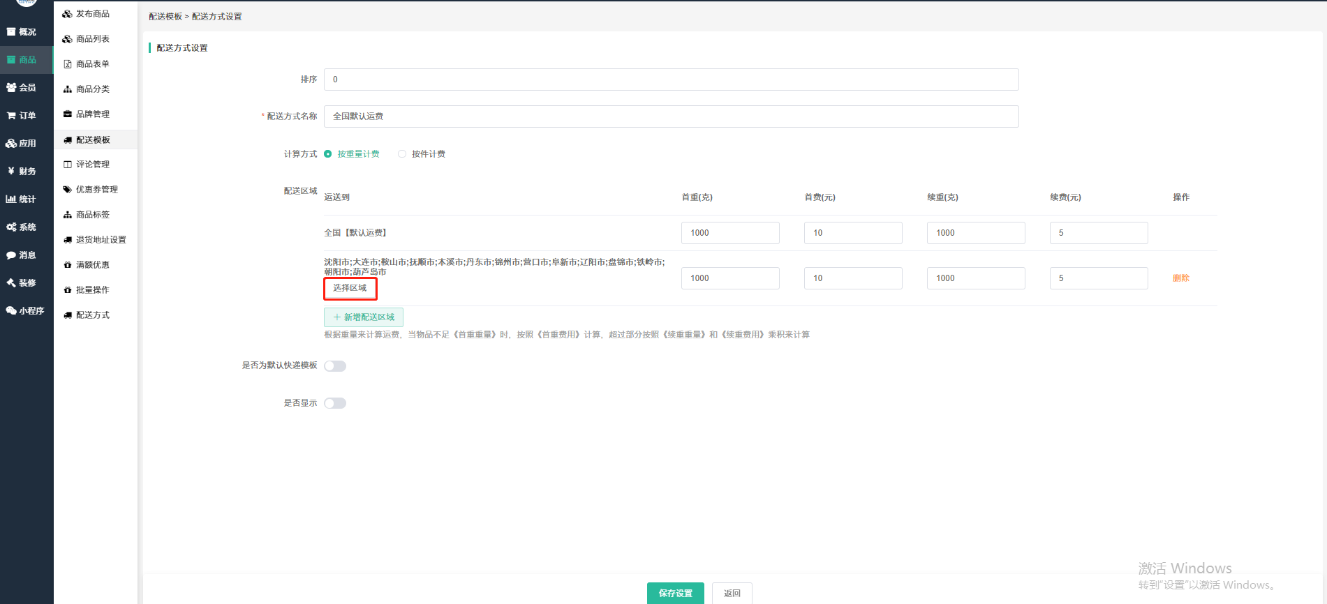 ## (2)、配送区域:如果您支持全国配送,不需要设置区域,默认为全国!!