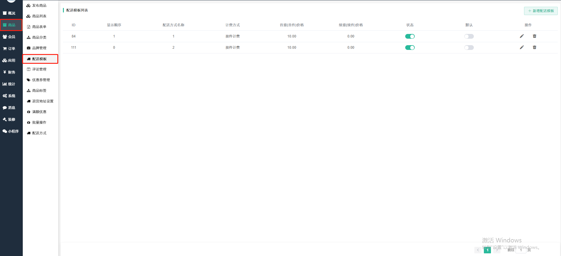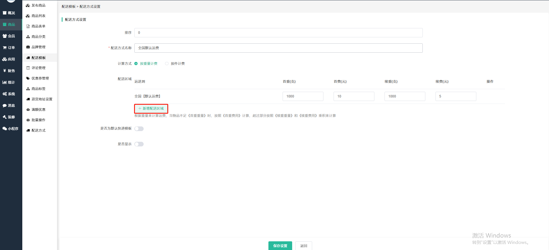 ## 添加商城配送方式:点击商品管理—配送模板—添加模板,如下: