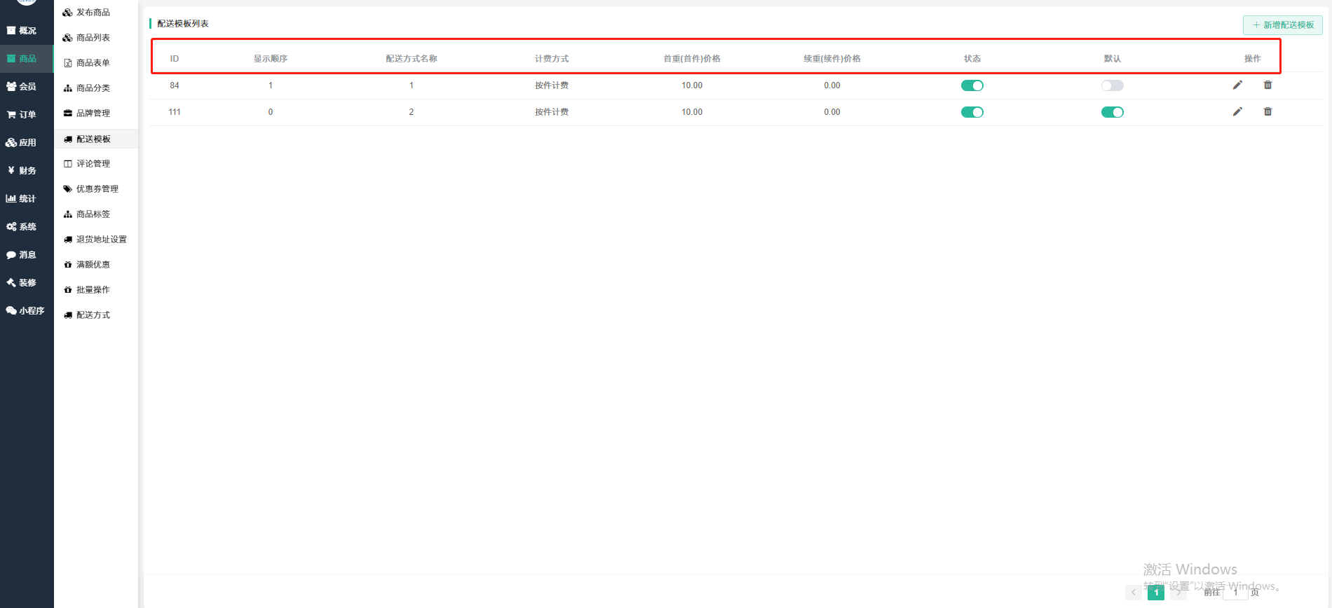 ## (3)在操作一栏可以进行编辑和删除运费模板信息
