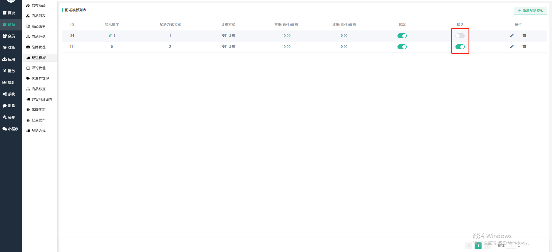 ## (2)运费模板的显示状态和是否为默认的运费模板状态。选择默认,则按照默认的快递模板进行计算运费。